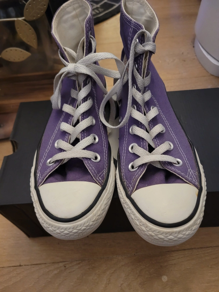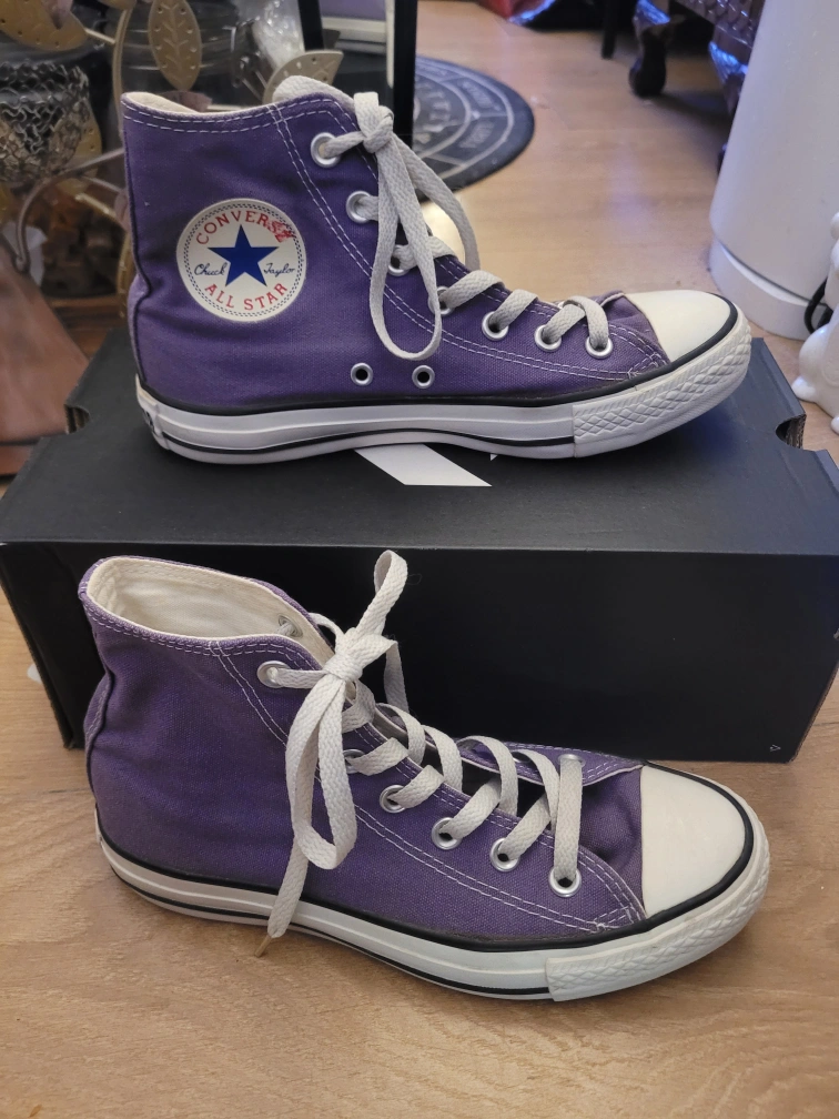 Purple Converse high-top sneakers. Comes with original box. ( Unisex) Size 7 Women's/ Size 5 Men's **** Cash Only **** **** Pickup Only **** **** No E-transfers **** **** Serious Inquiries Only/ Serious Offers Only ****
