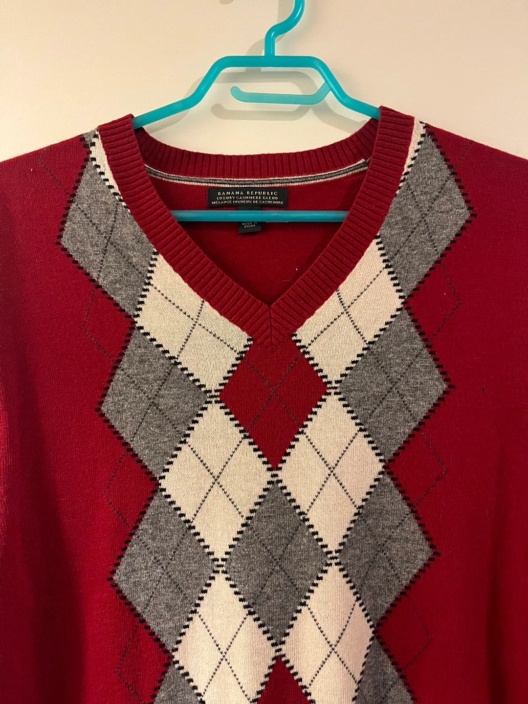 1000+Red cashmere sweater with a white and grey diamond pattern. V-neck. Long sleeves.