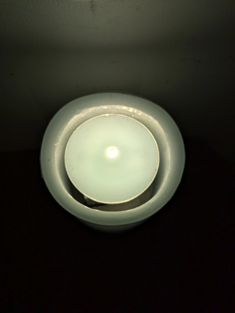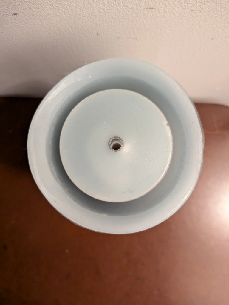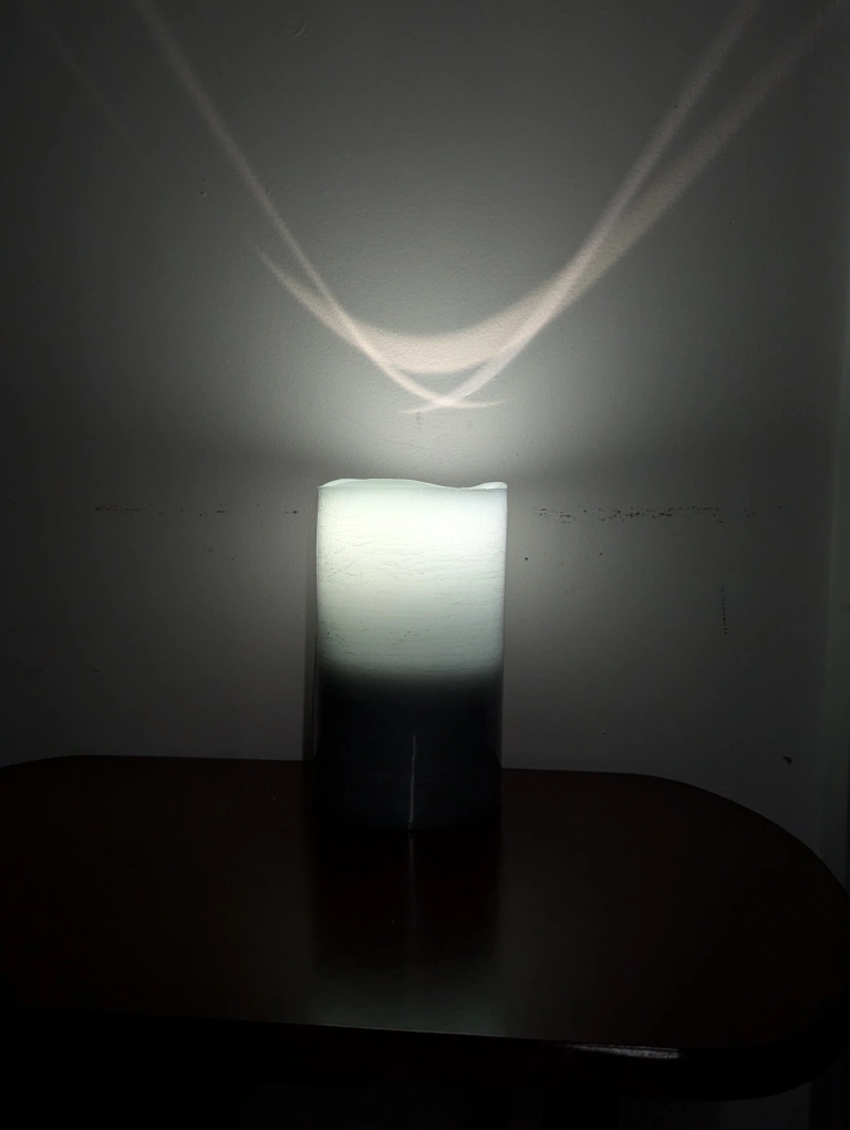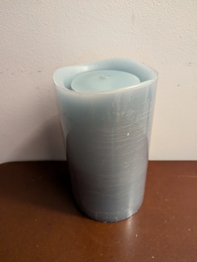 LED candle with pale blue real wax exterior (wrapped in a clear plastic sheath that protects its "like new" status). A switch on the bottom turns it on, off, or to a timer.
