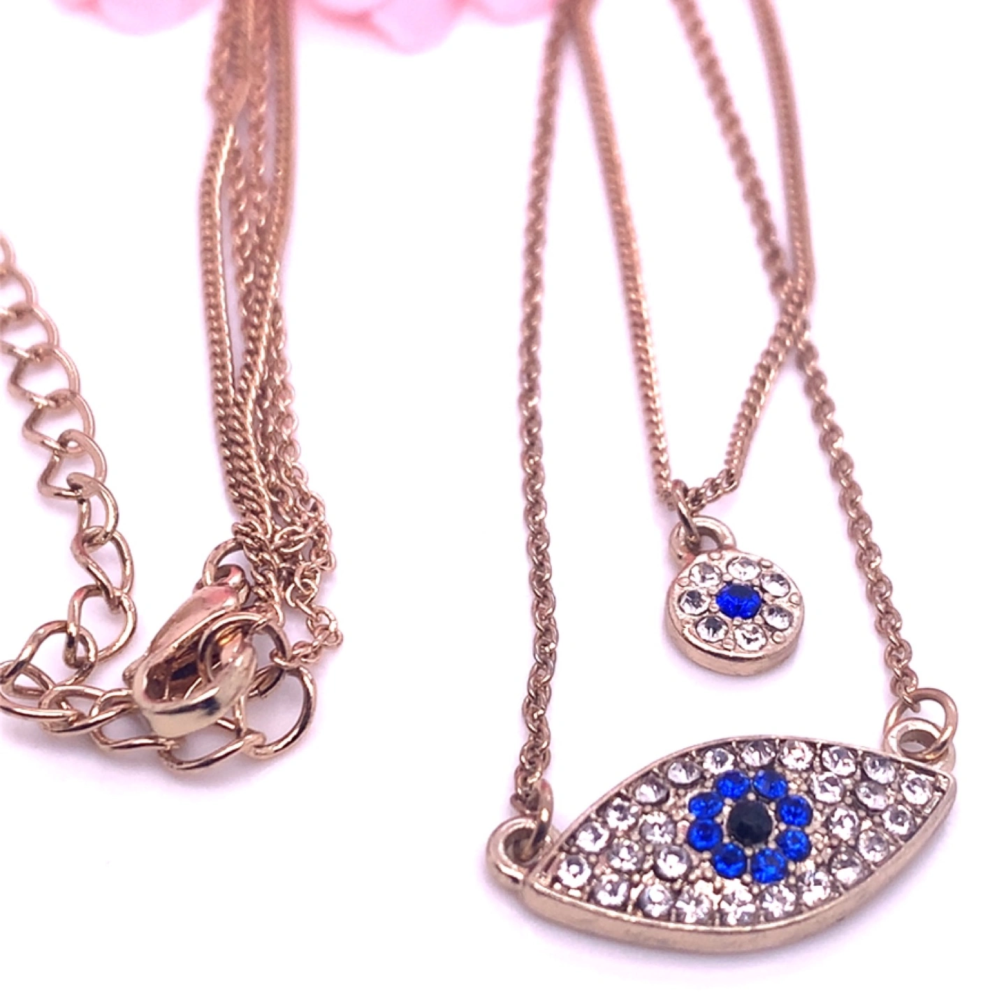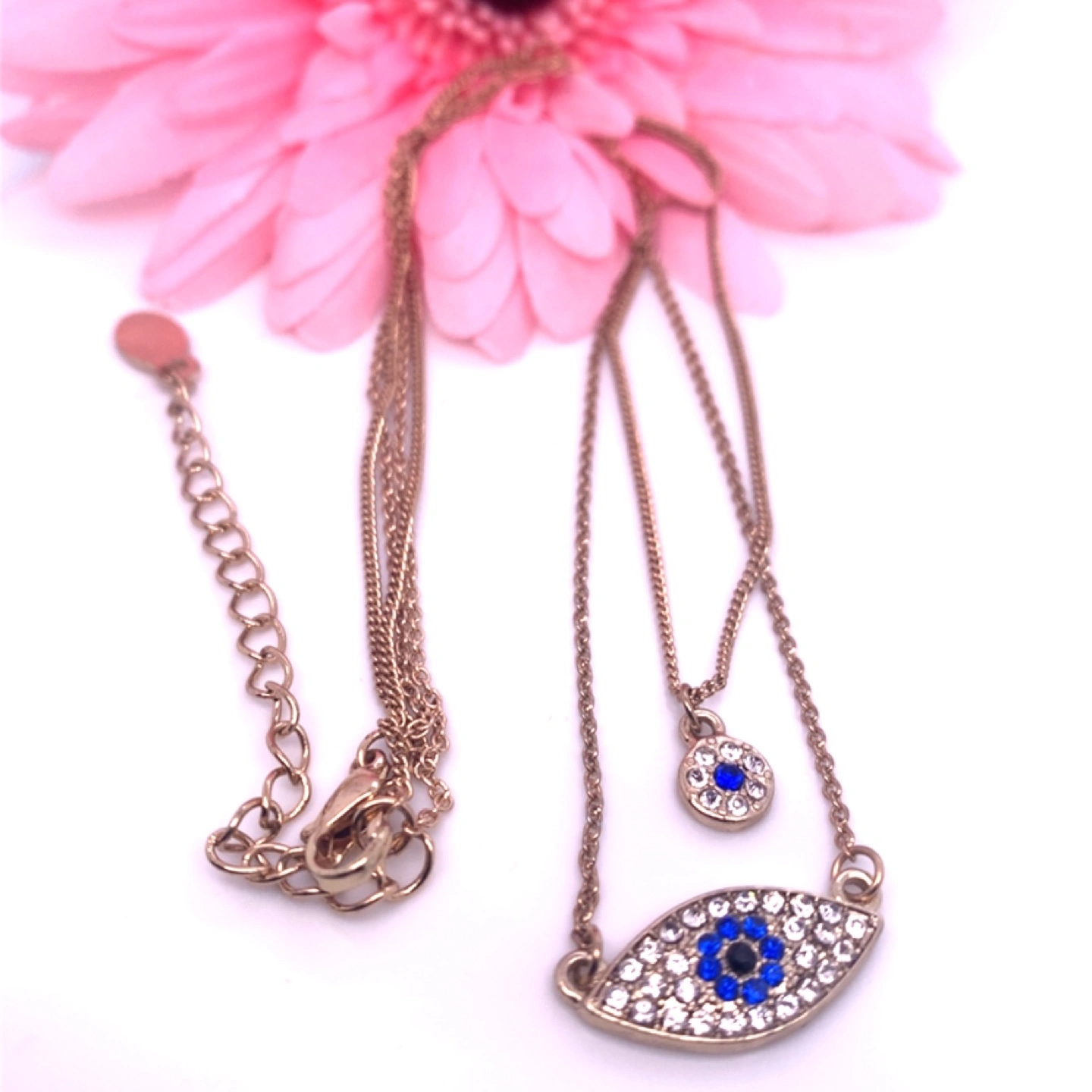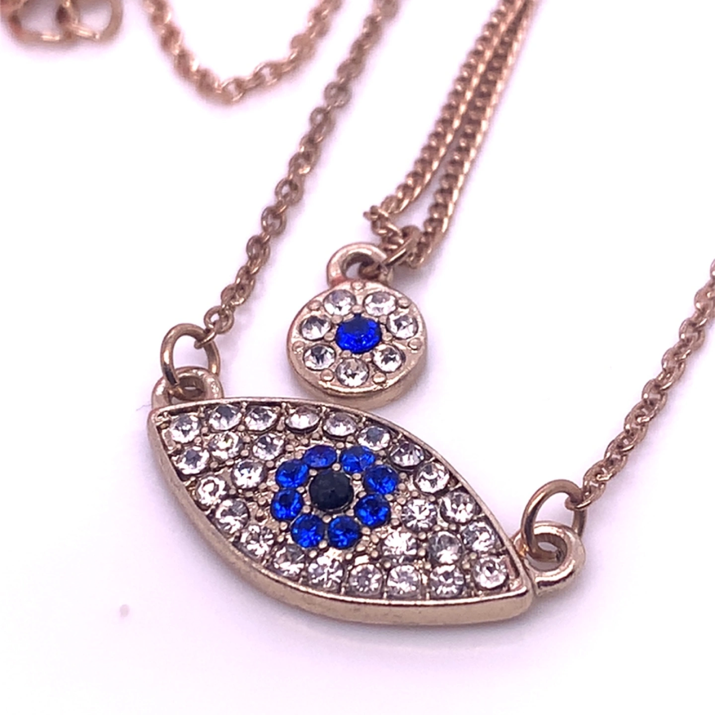 Gold chain necklace with an evil eye pendant and a smaller evil eye charm. The pendant has clear and blue crystals.