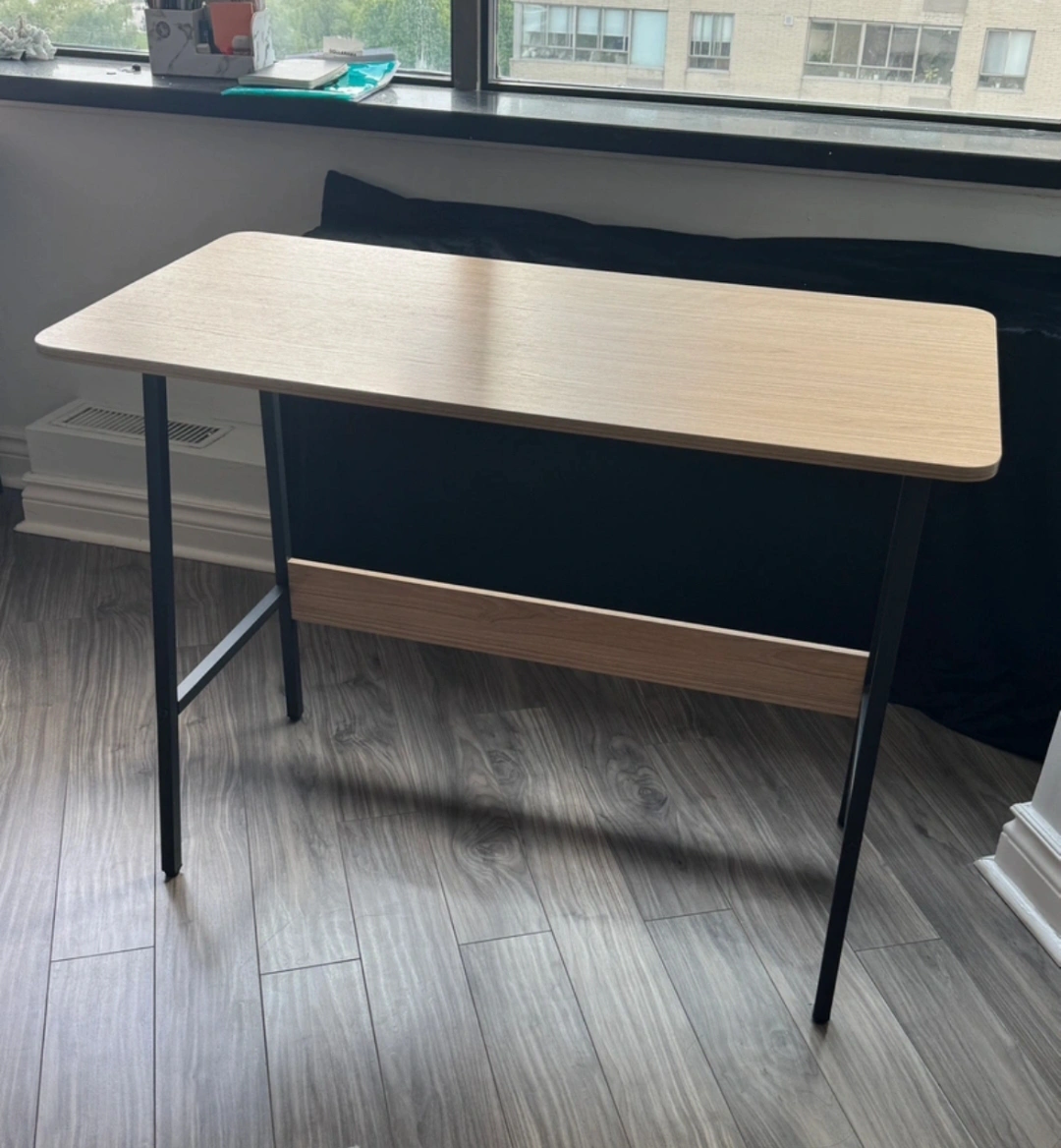 working desk with black metal legs. Woodgrain laminate top and shelf.It's 38x24x30 inches.Plz, don't send is this available msg. If the ad is active, it is available. Just msg if you have serious enquiry.plz