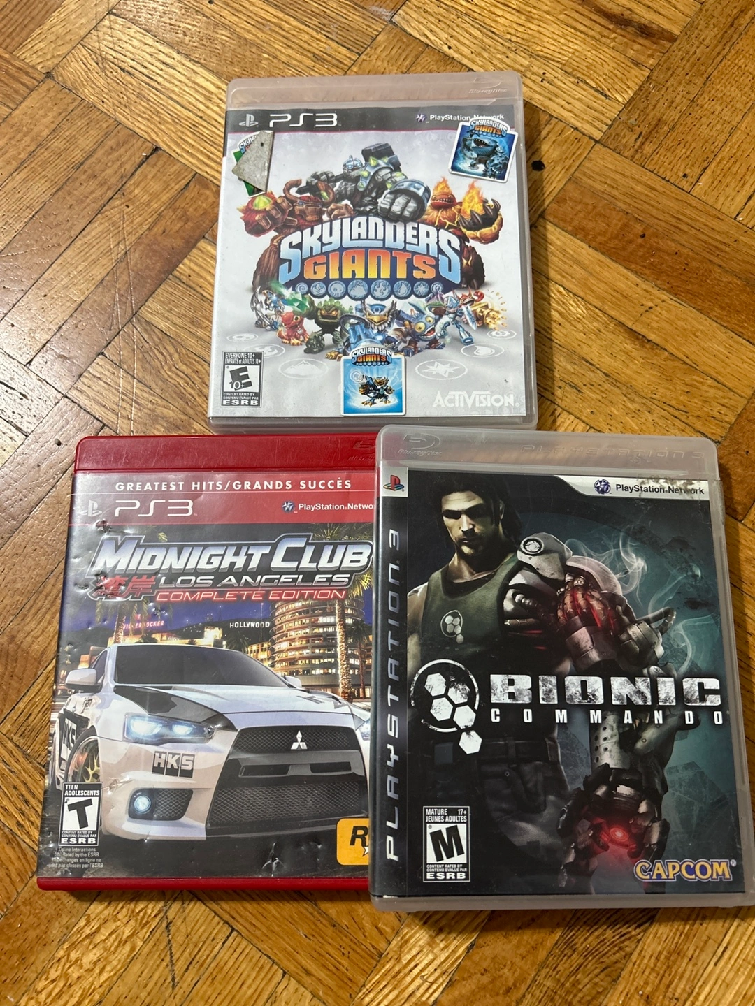 Three PS3 video games. Skylanders Giants, Midnight Club: Los Angeles Complete Edition, and Bionic Commando. All games are in pre-owned condition.