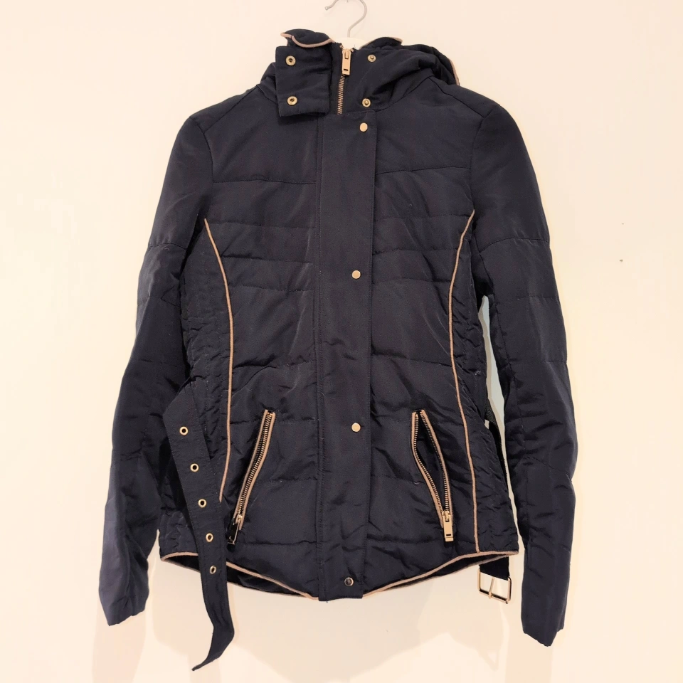Navy blue puffer jacket with a faux fur hood, belt, and gold hardware. Size M.