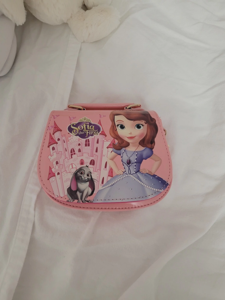 light pink purse with a Sofia the First design at the front . has a button closure and an adjustable strap. great condtion!