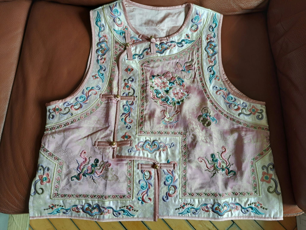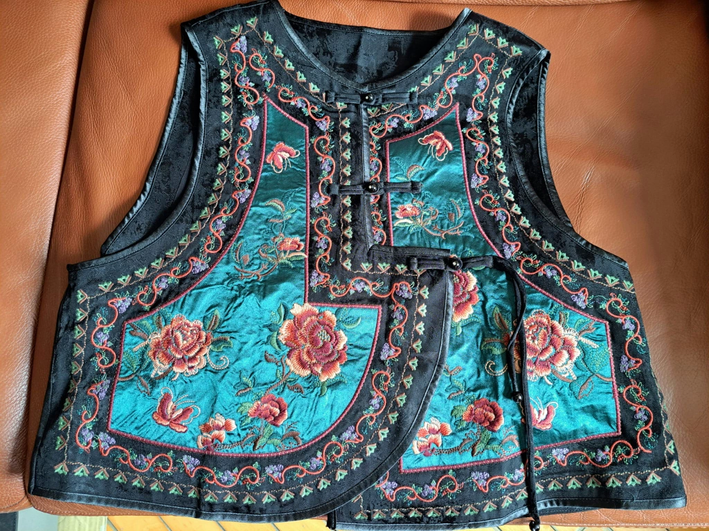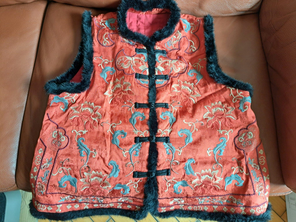 Three vintage Chinese silk vests with intricate embroidery. All have a high collar and frog closures. One has a black faux fur trim. In good condition. brand new, different styles and designs $250 each....