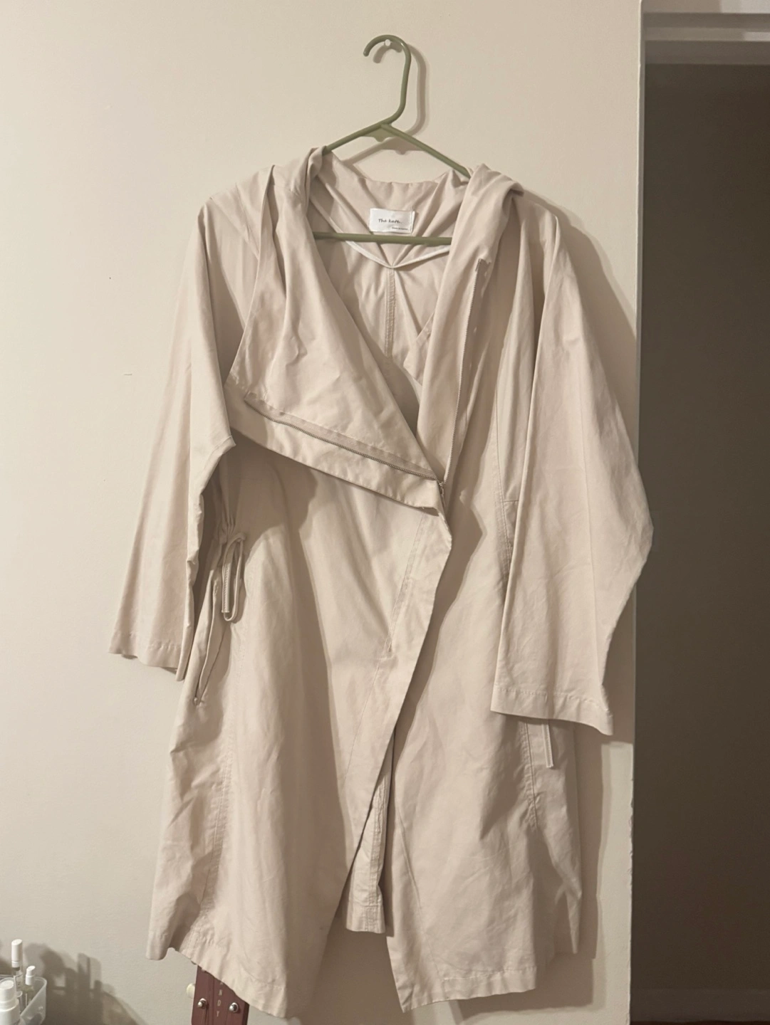 856Lightweight, long-sleeved jacket with a hood, a zip closure, and pockets. It has a tie at the waist. It is in great condition.