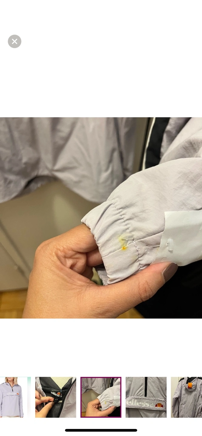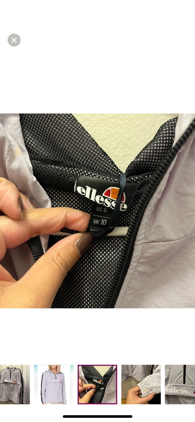 Purple light jacket with black accents. Size US 6. Has a hood and a zip closure.