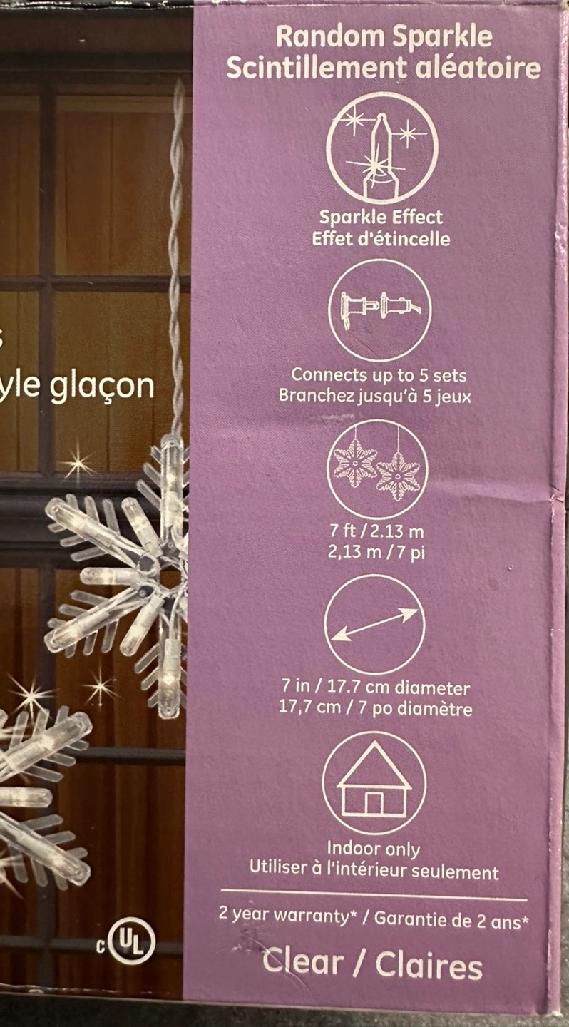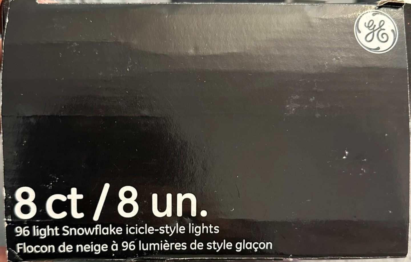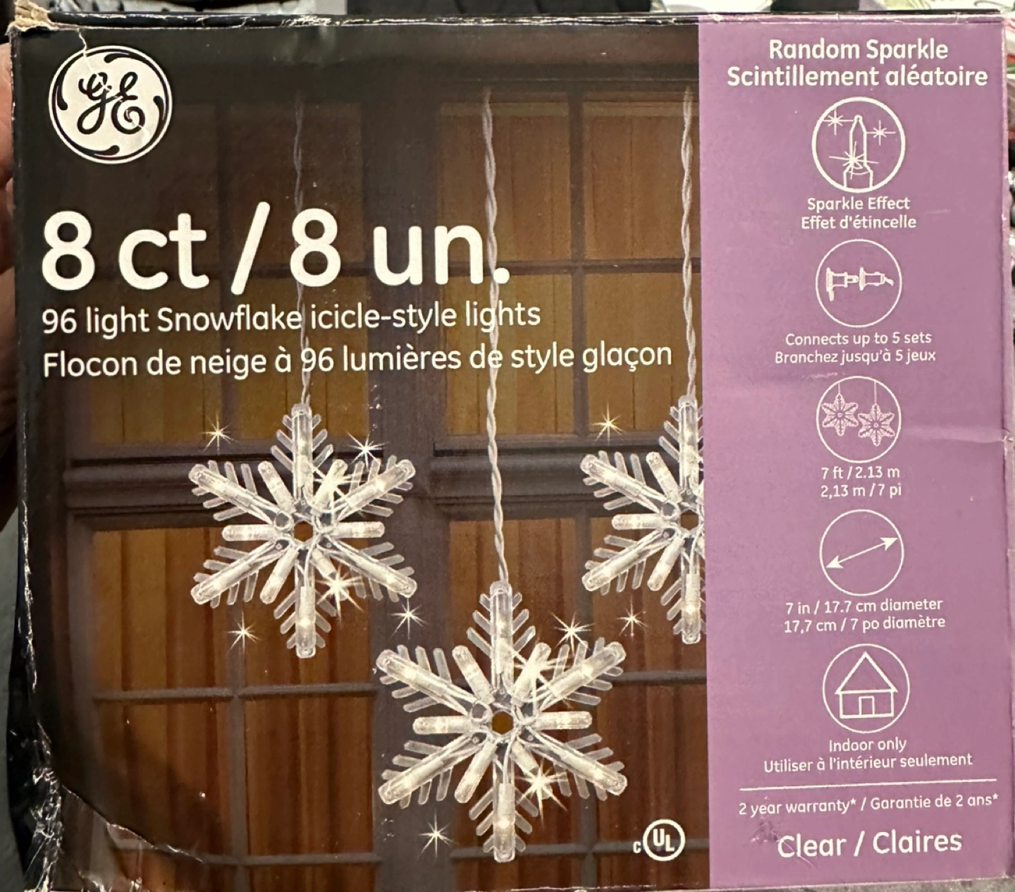 768 count of GE snowflake icicle string lights. 96 lights. Clear. Indoor use only. 7 feet with eight snowflakes at 7 inches apart.