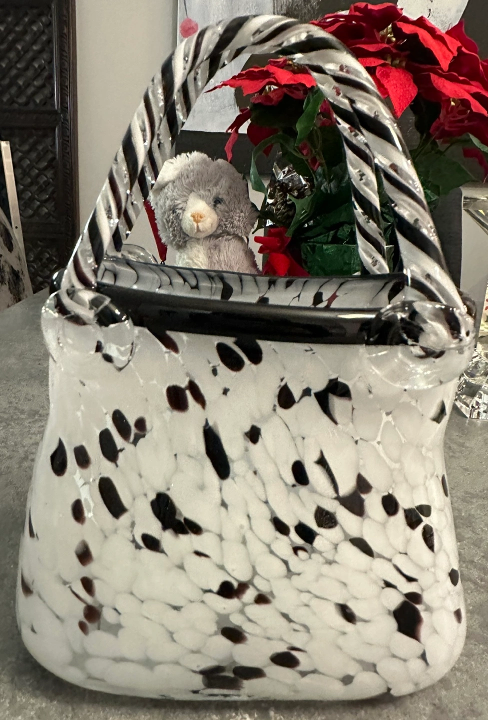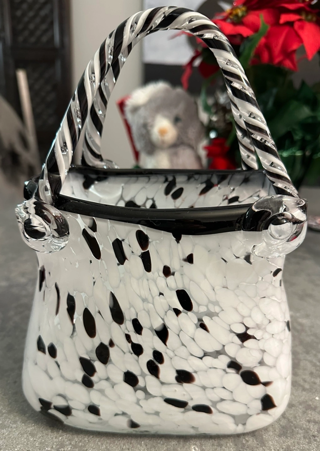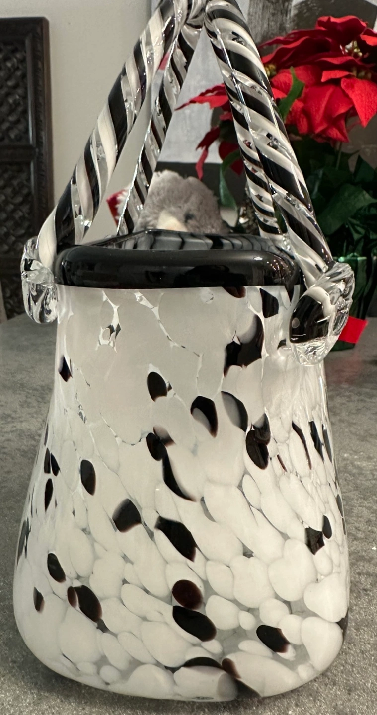 86White and black glass handbag vase. Twisted glass handles. No damage.