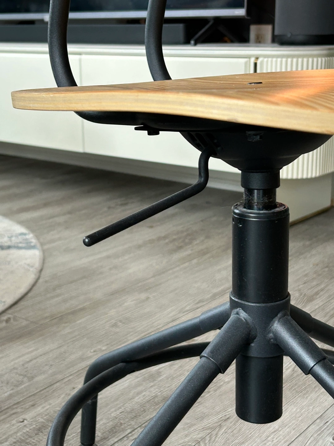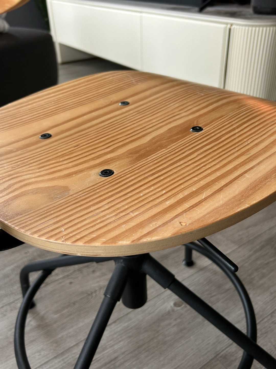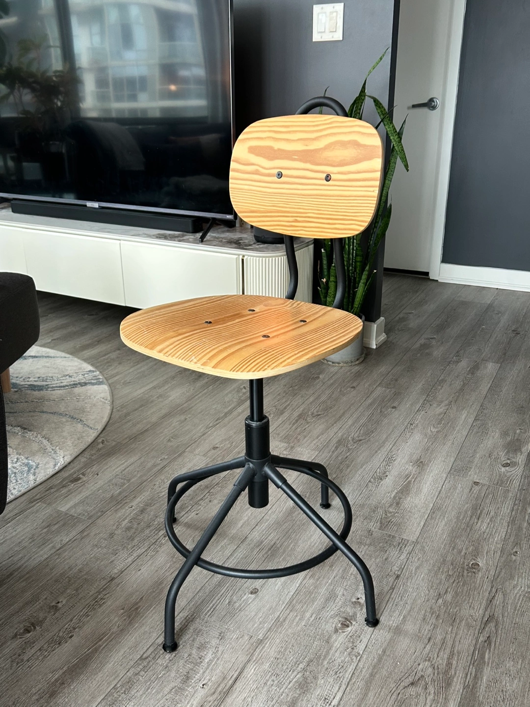 Stylish and adjustable industrial-style desk chair with a sturdy metal frame and a solid wood seat. Perfect for home offices, study spaces, or workstations.