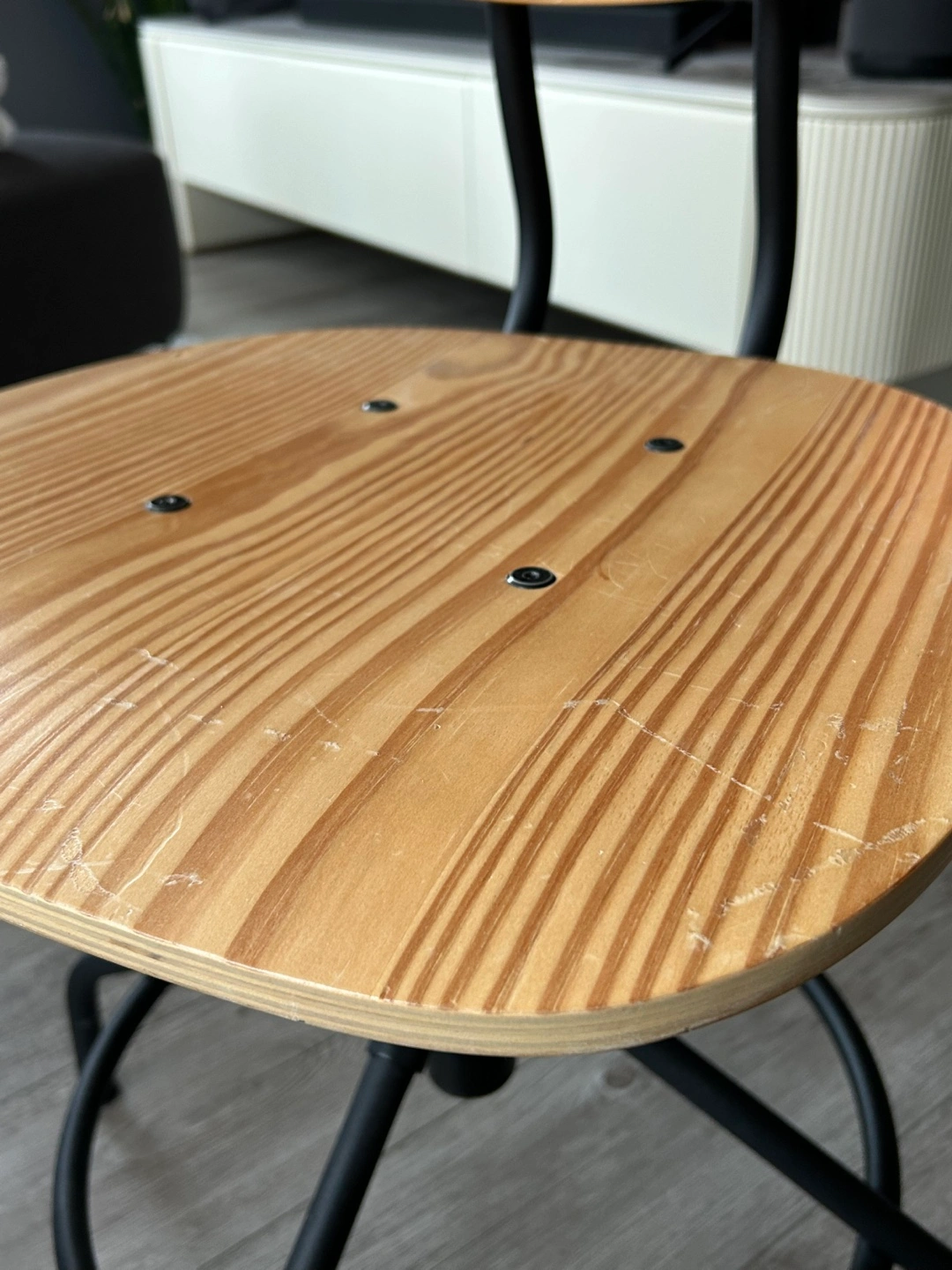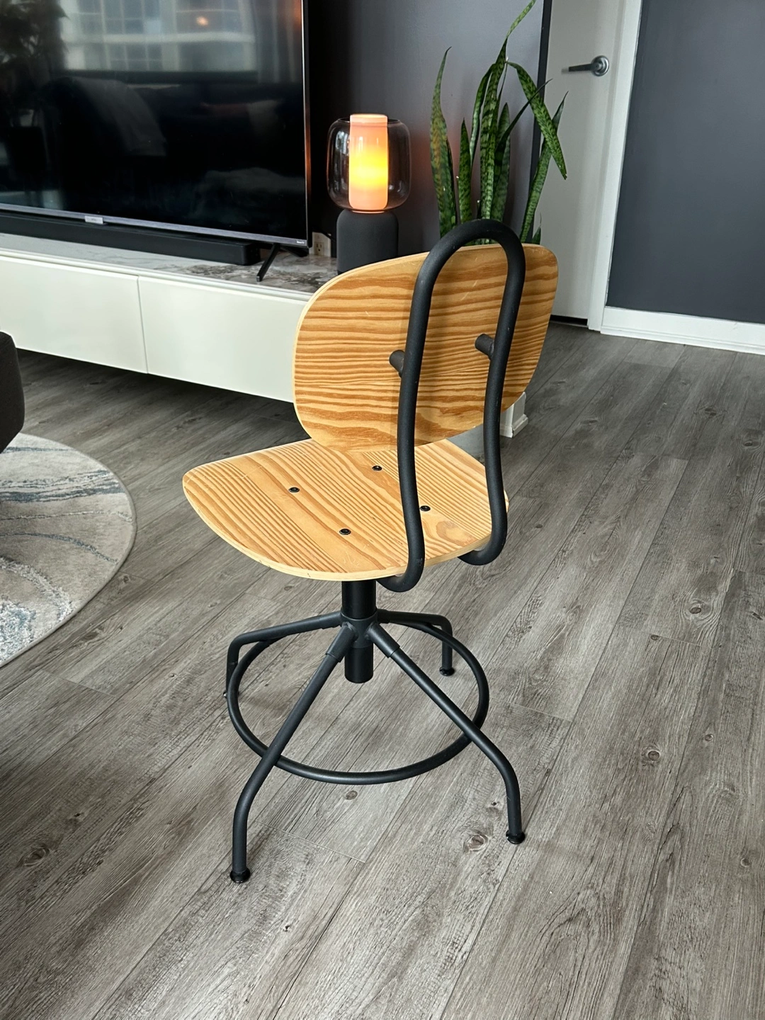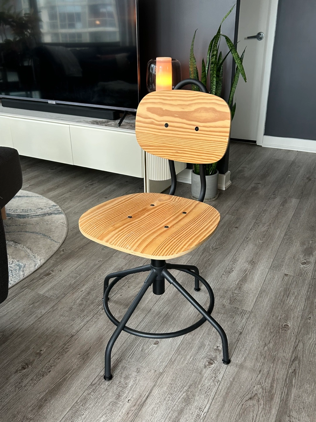 Stylish and adjustable industrial-style desk chair with a sturdy metal frame and a solid wood seat. Perfect for home offices, study spaces, or workstations.