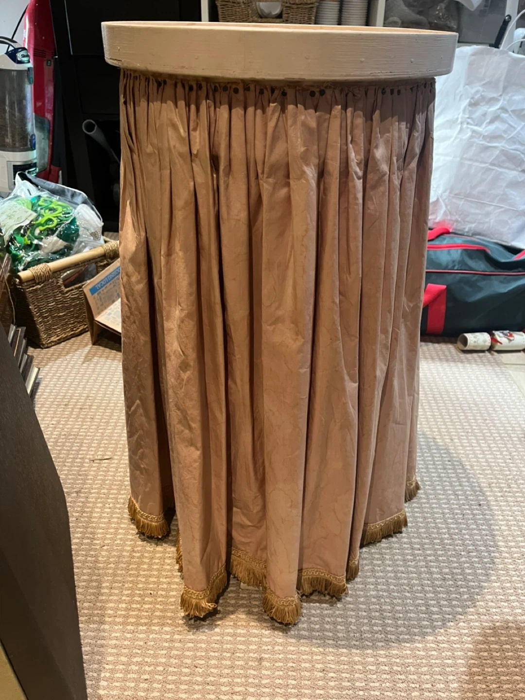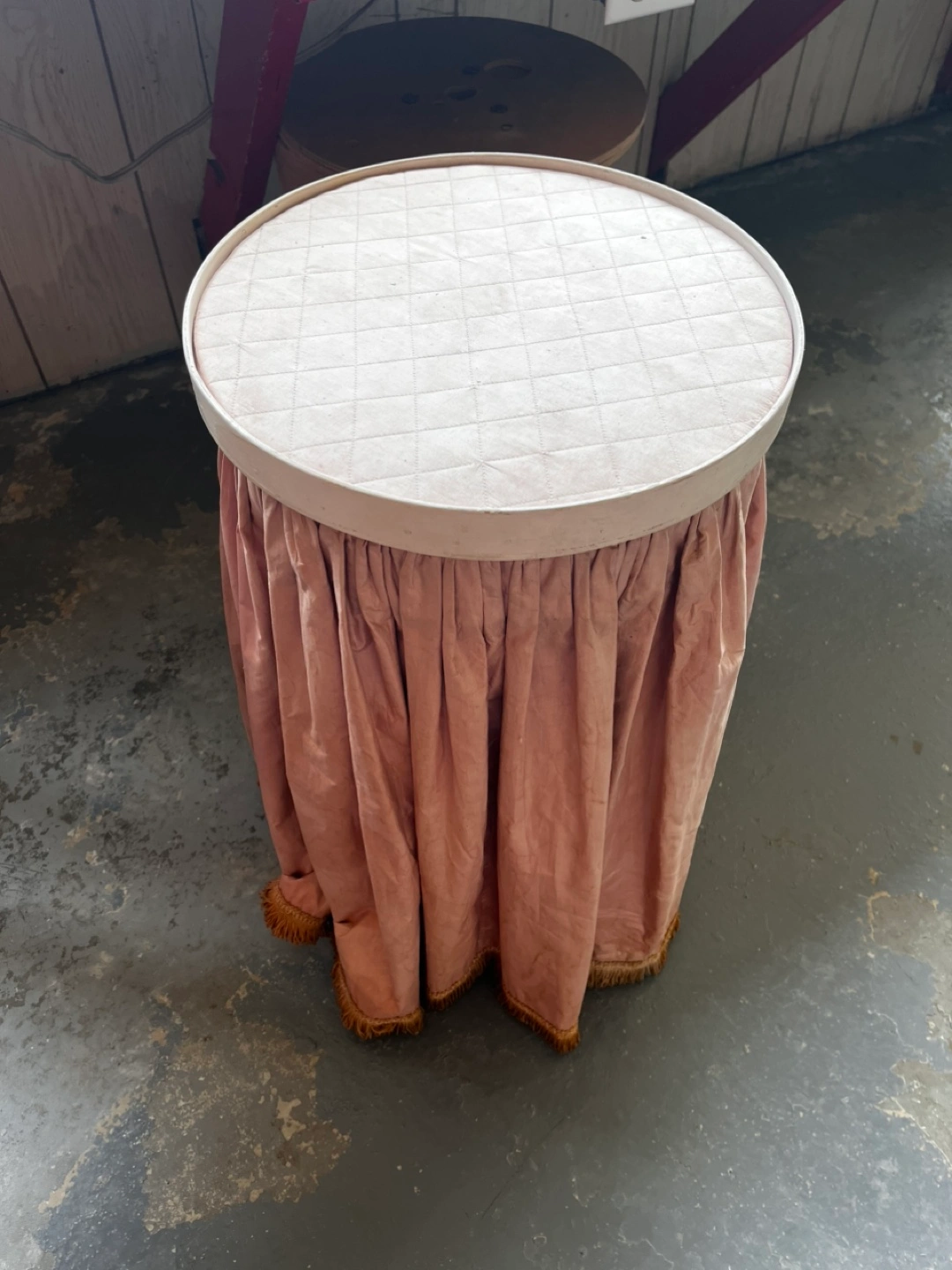 Dusty rose pink vintage laundry hamper with a removable lid. In good condition. Has pink fabric around the bottom and the lid has a quilted top which needs recovering. The body is quite light, made of wood.