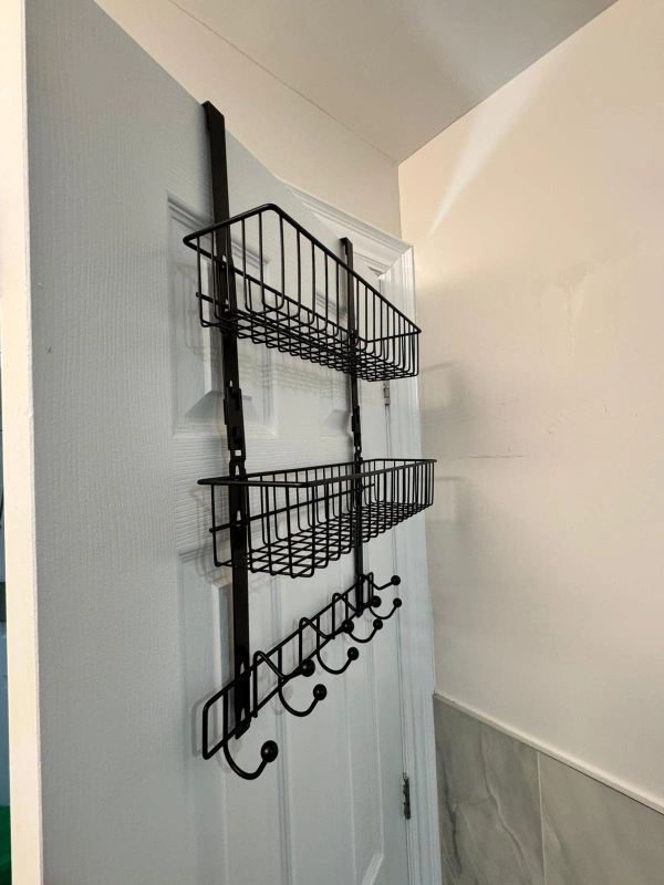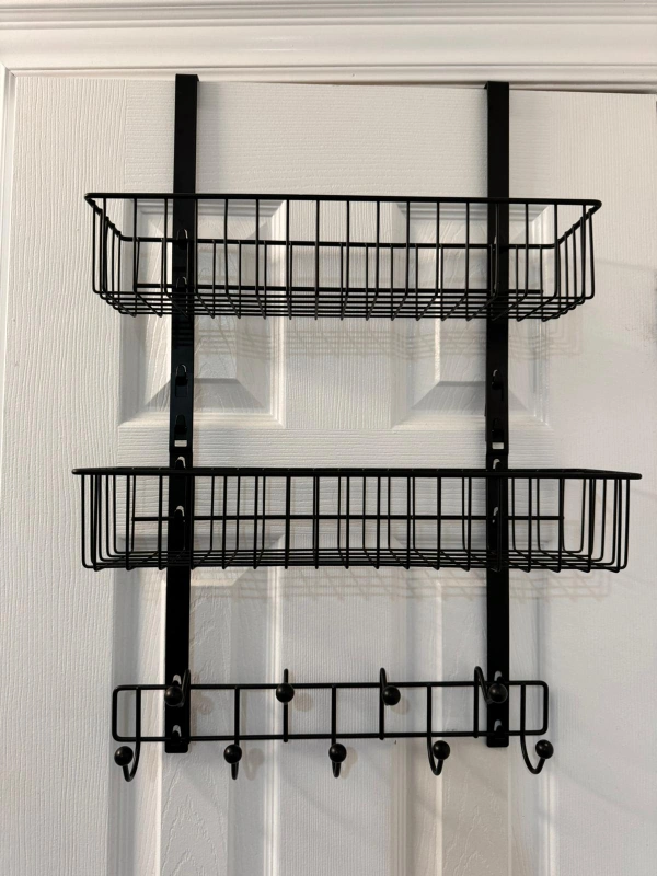 Black over the door storage unit with two wire shelves and 9 hooks. Perfect for organizing any room.