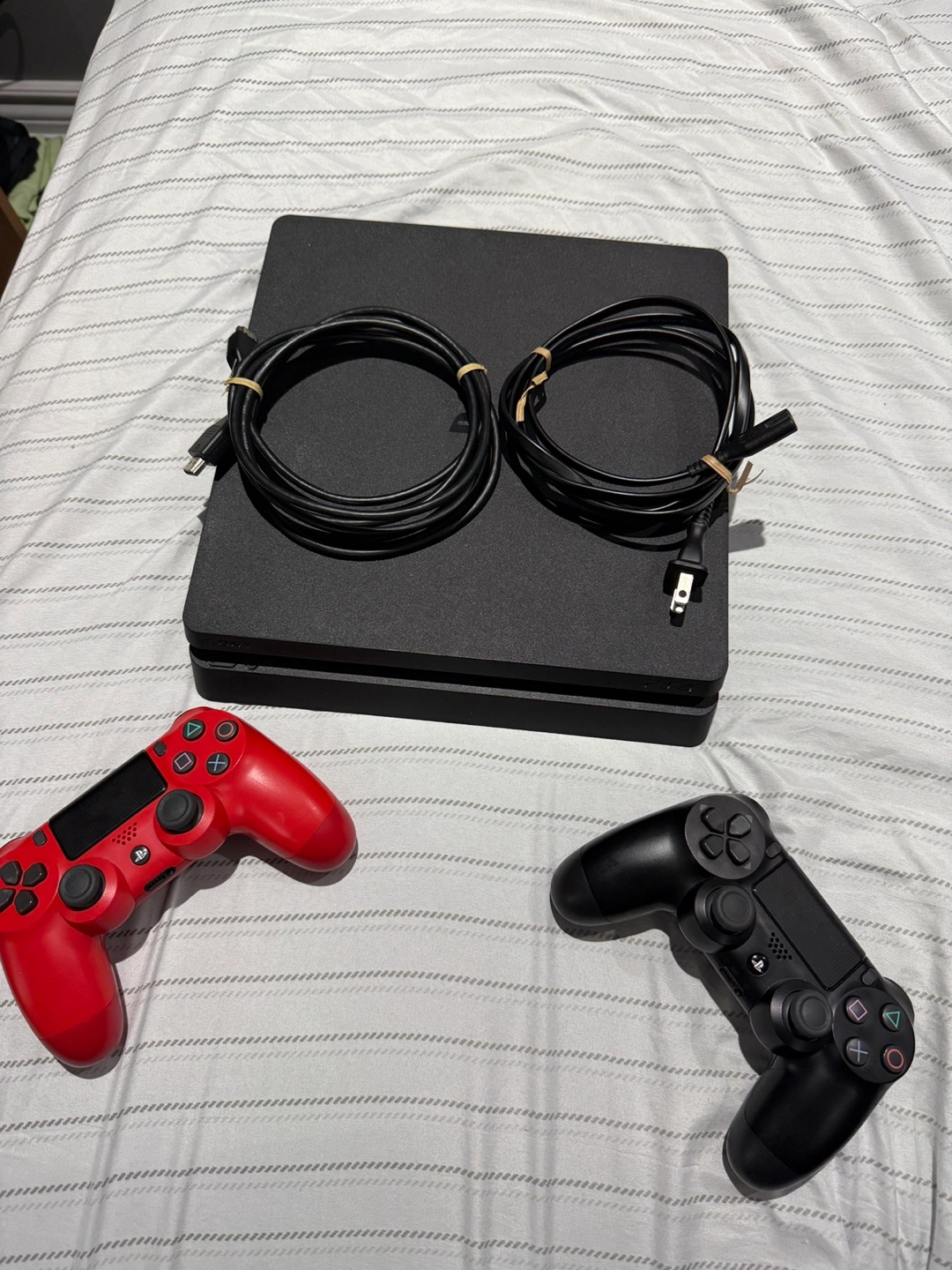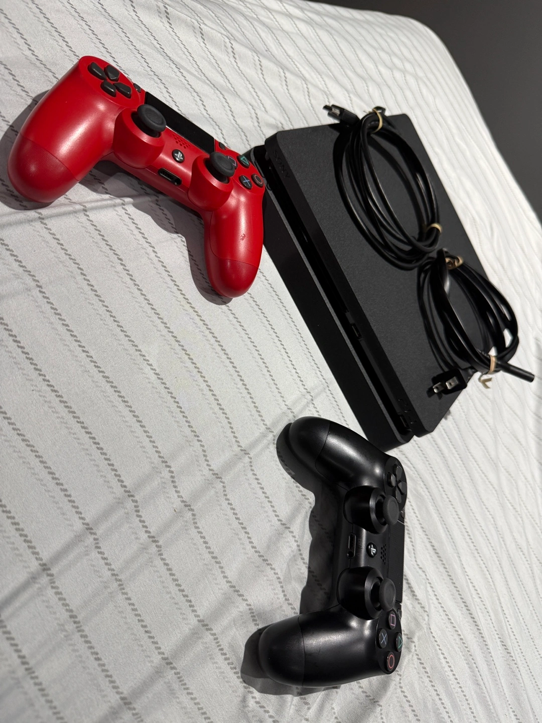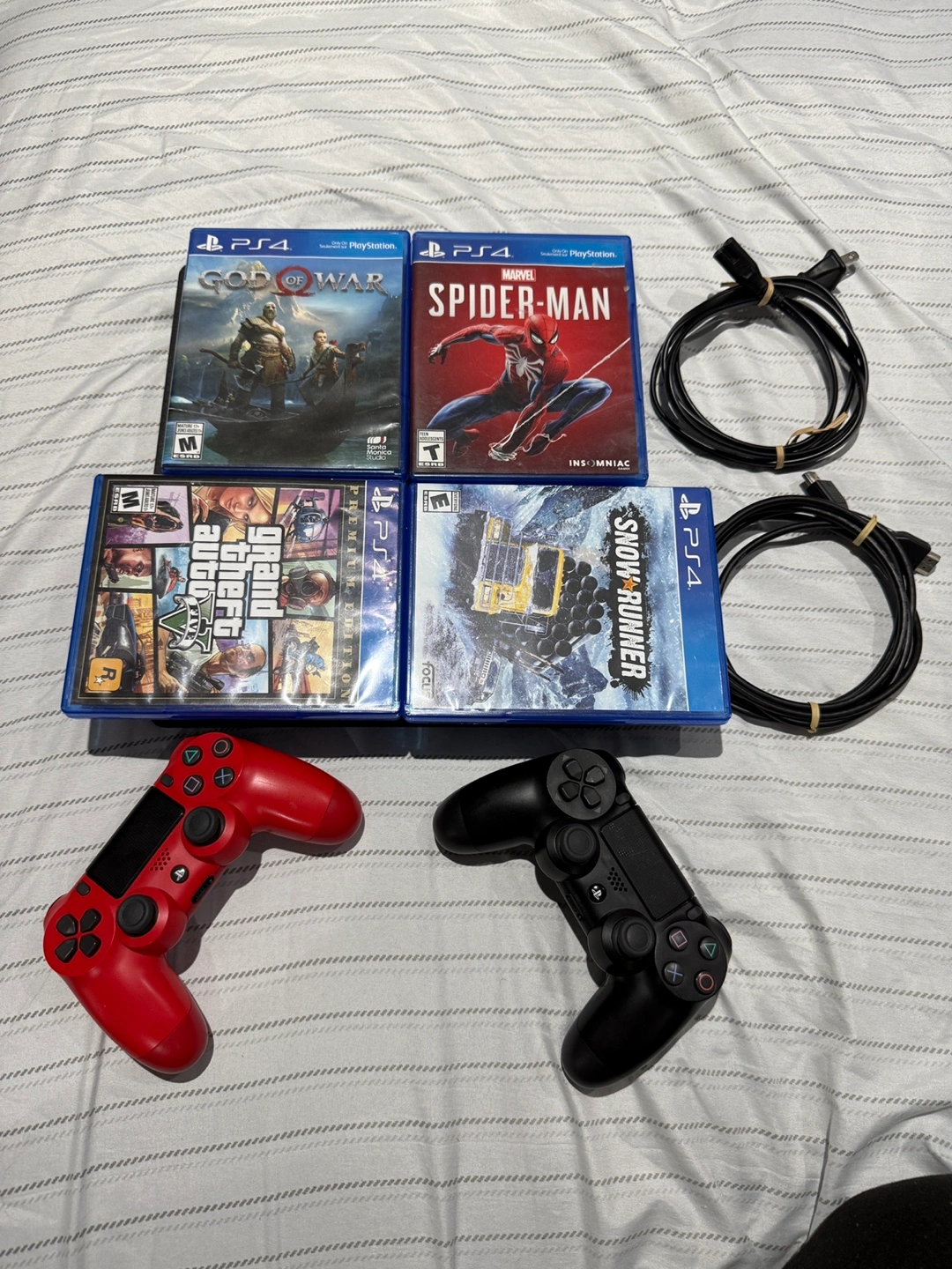 PS4 console with 2 controllers, 4 games, and cables. One red controller and one black. God of war Spider man GTA 5 Snow Runner