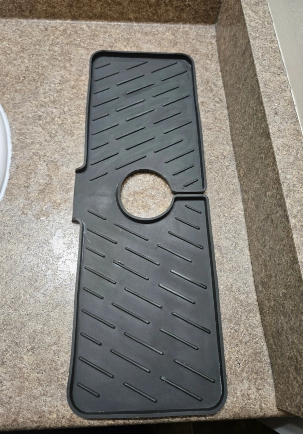 Black silicone sink mat. Great for protecting your sink from scratches and can be used to put soap on it. Has a drain hole to allow water to flow through. Pet/smoke-free home.