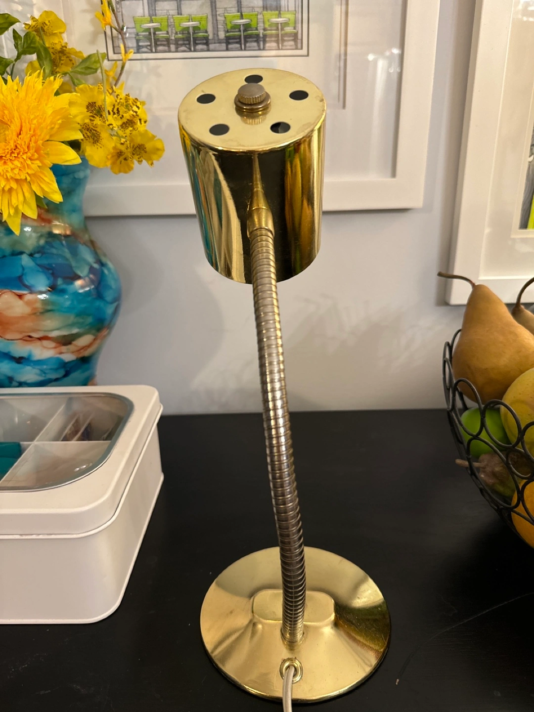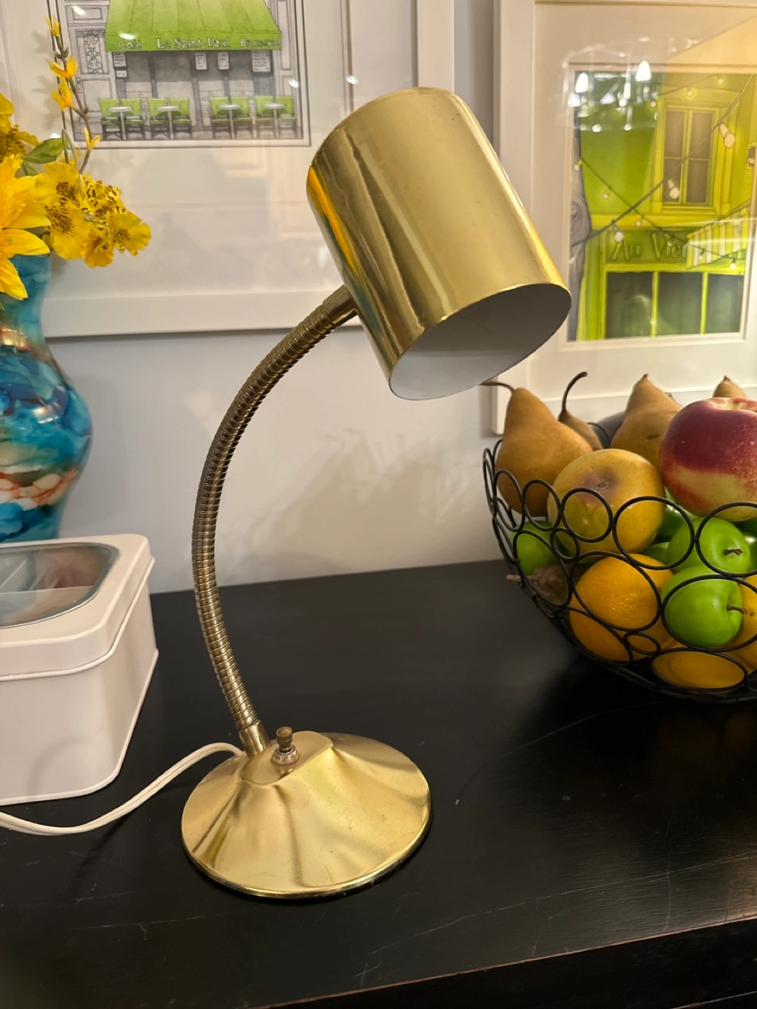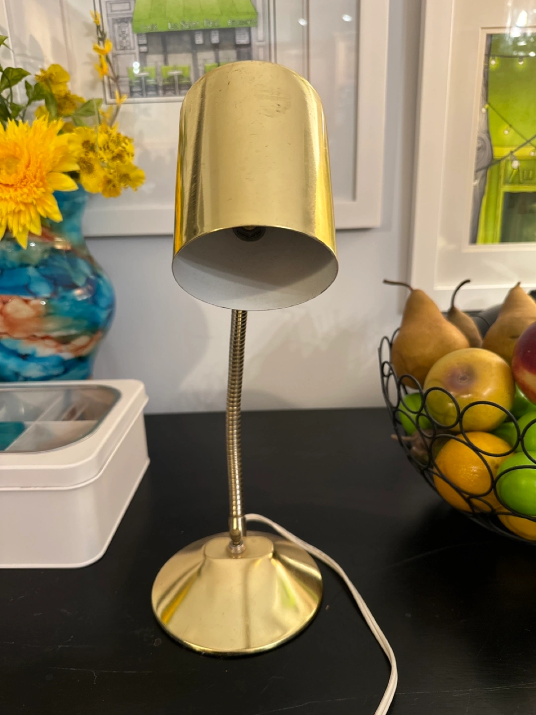 Add a touch of vintage sophistication to your desk with this Gold Gooseneck Desk Lamp. Featuring a flexible neck for adjustable lighting, a round base for stability, and a sleek white interior that maximizes light reflection. Perfect for reading, working, studying or accent lighting, this pristine lamp provides both functionality and classic, vintage style.