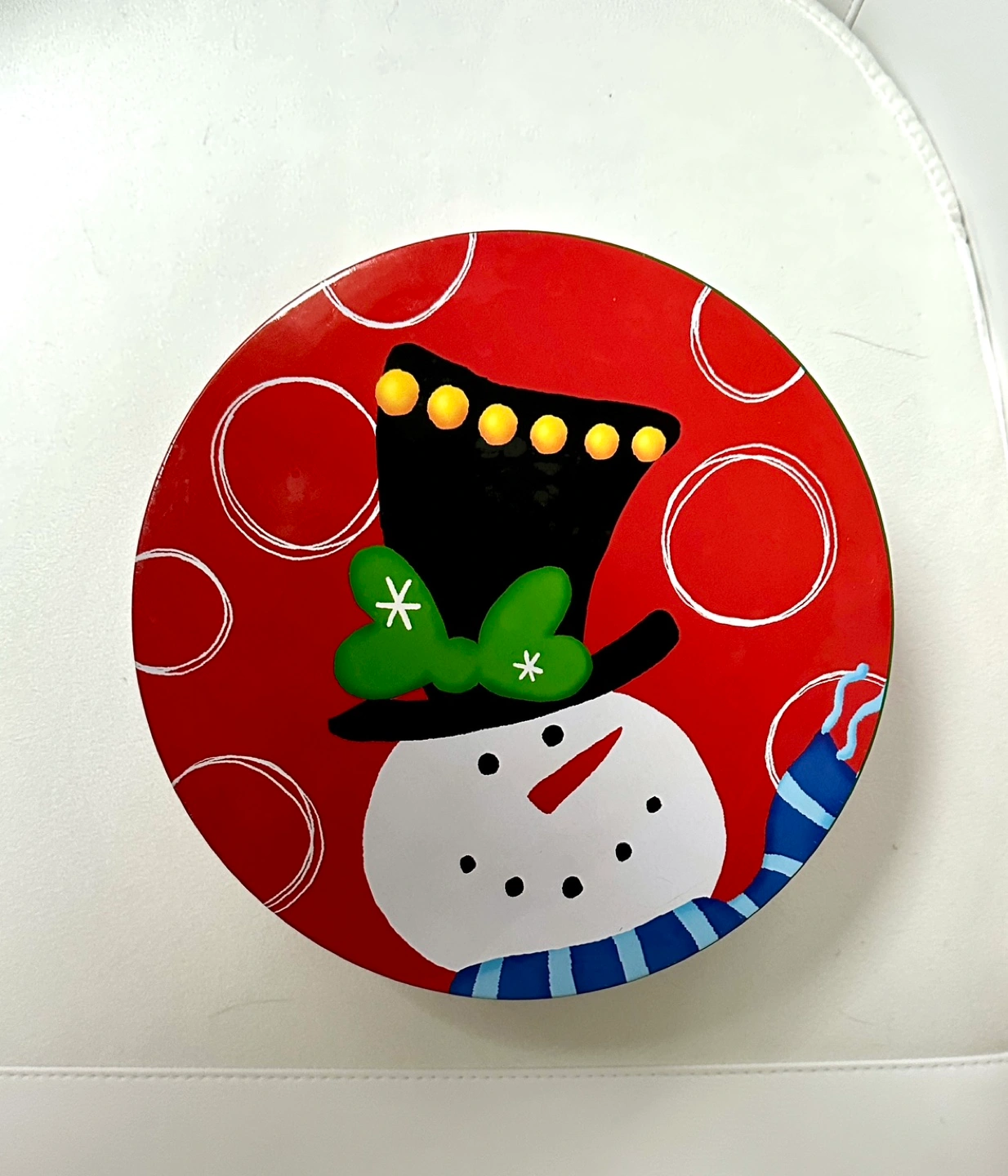 Christmas cookie tin with a snowman on the lid and holiday decorations on the sides. Large capacity for cake or cookies.