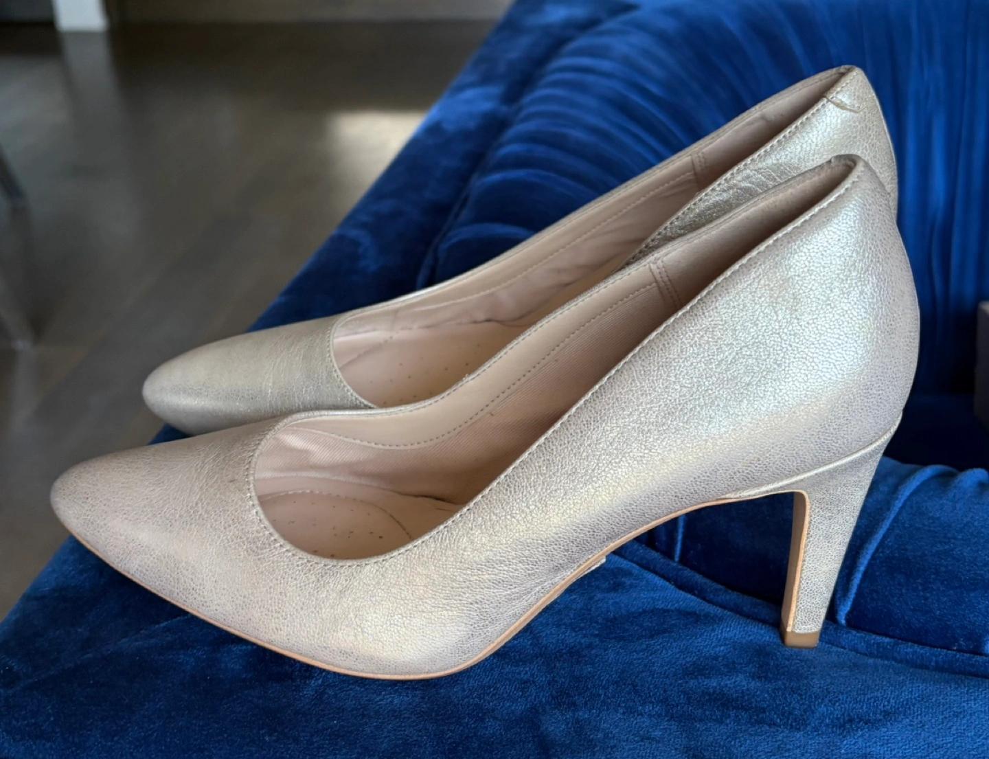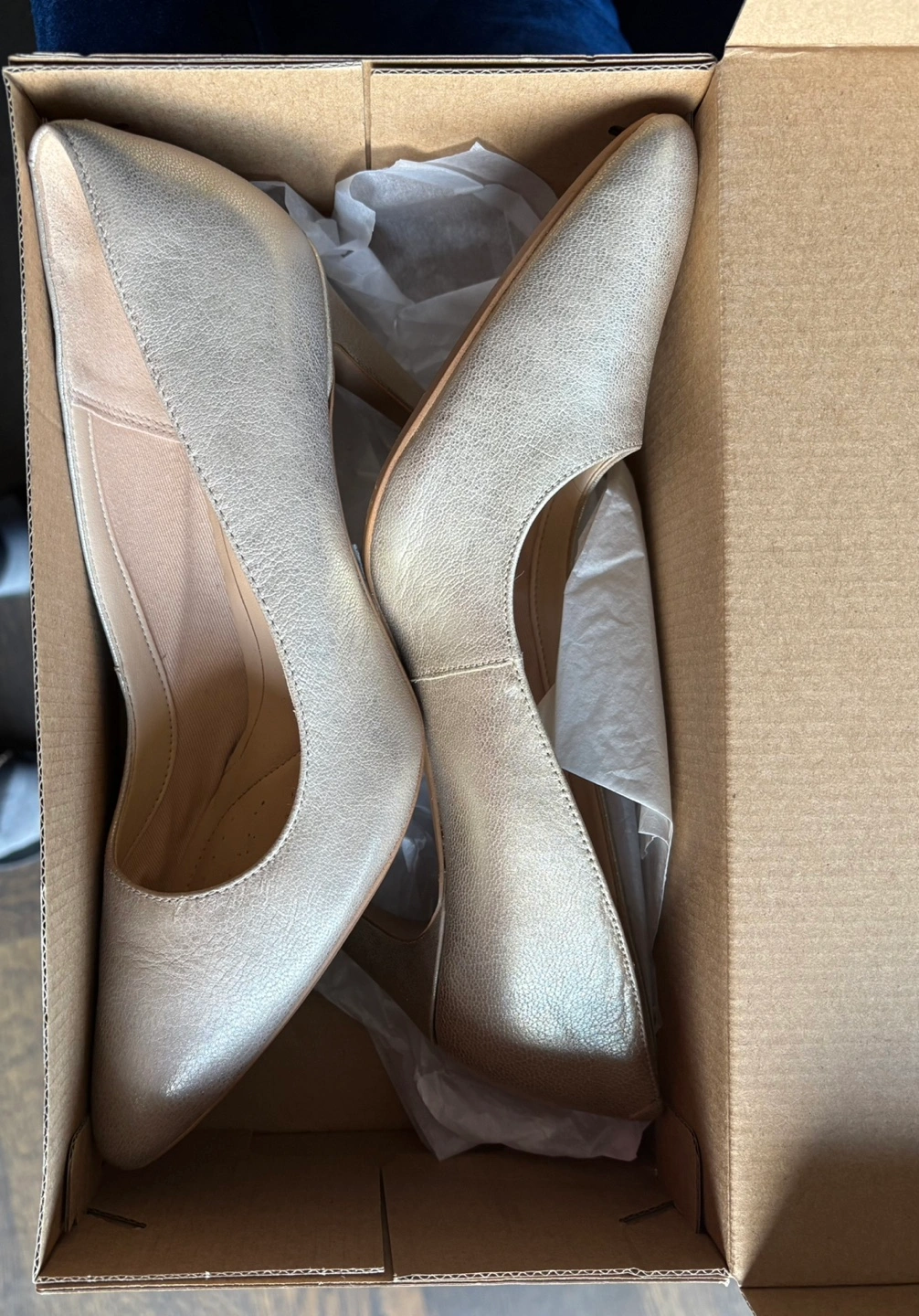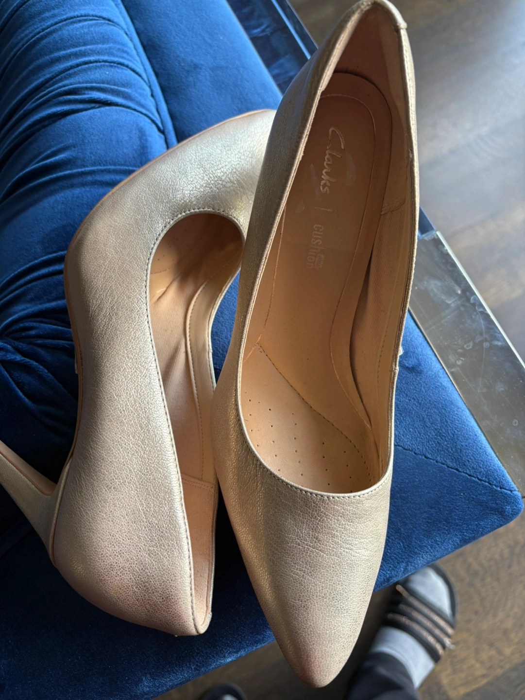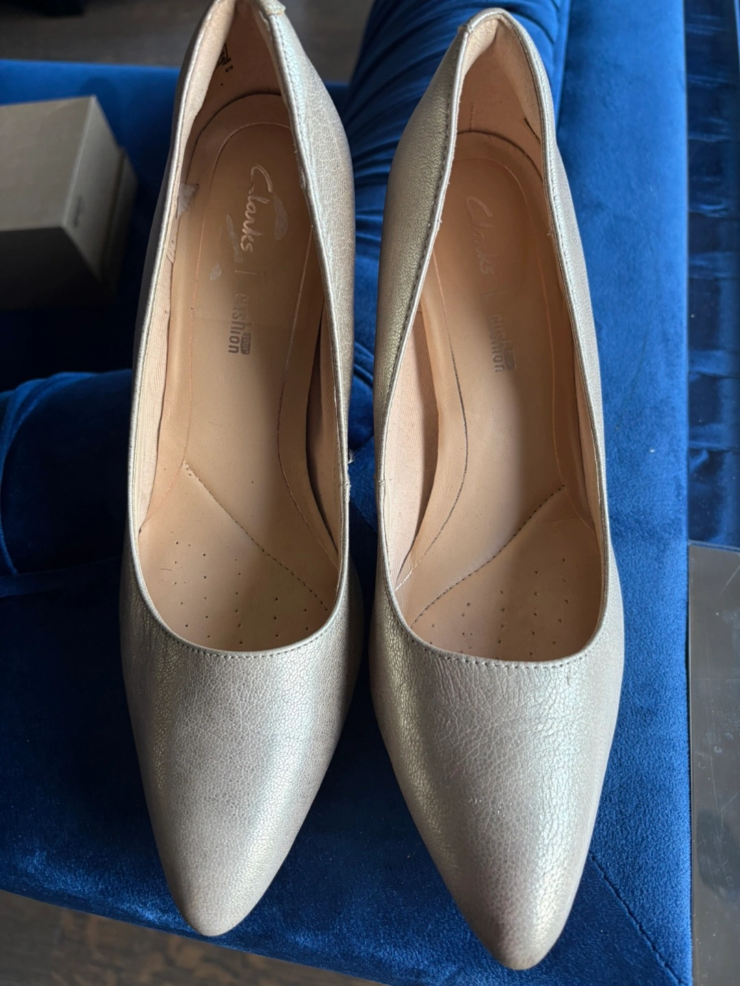 Gold heeled shoes with a pointed toe. Cushion soft insoles. Comes with original box.