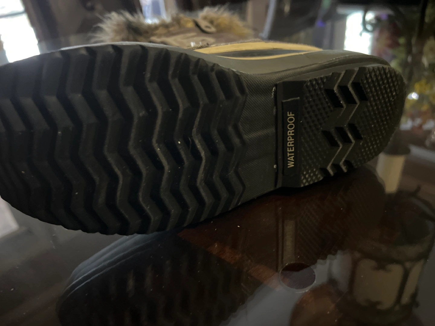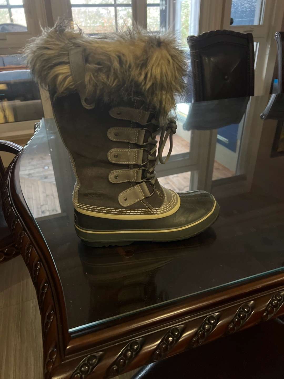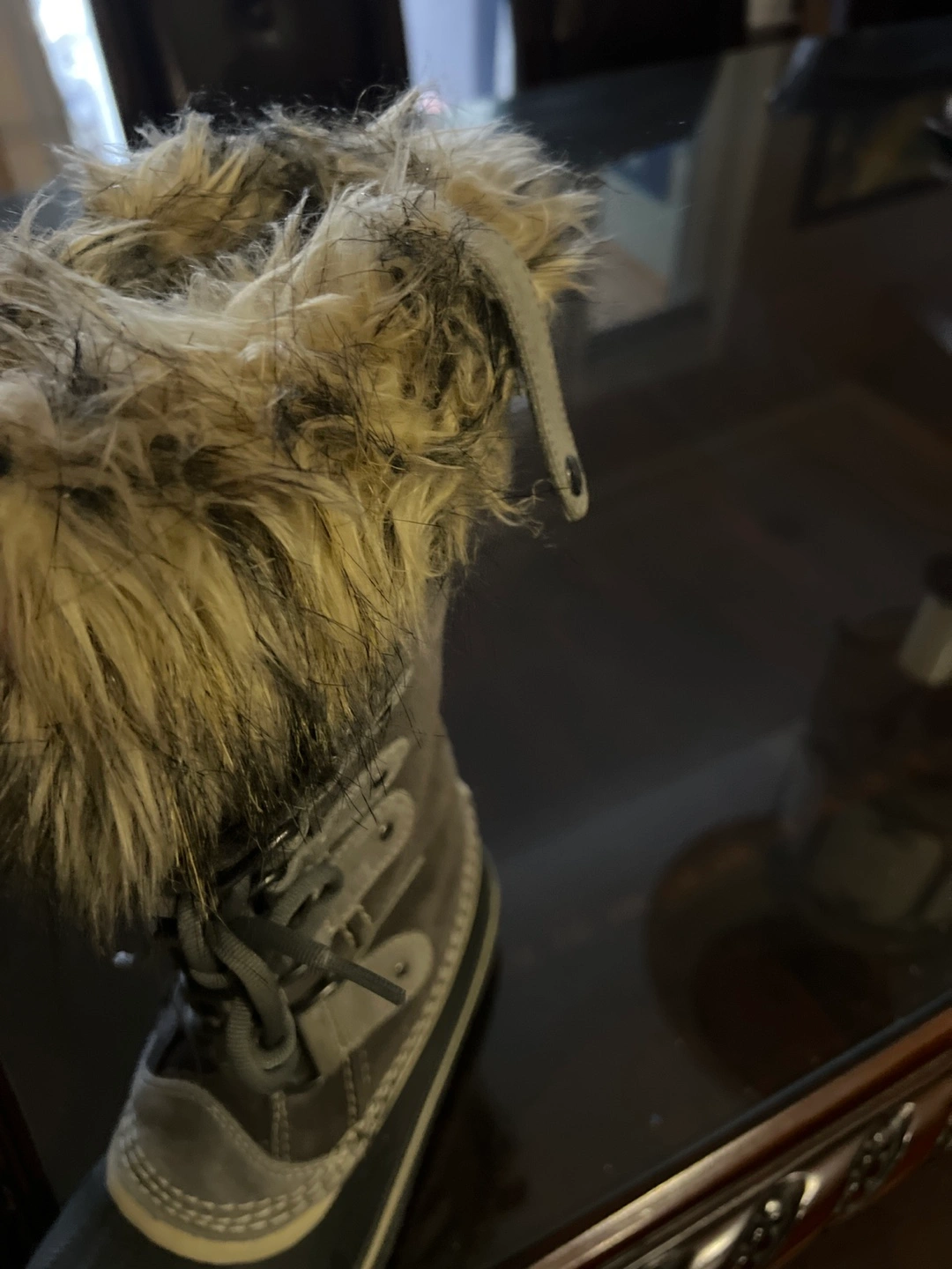 Gray suede winter boots with fur trim, lace up closure, waterproof. *see picture. One pull is lifted. Easy fix