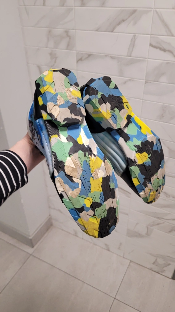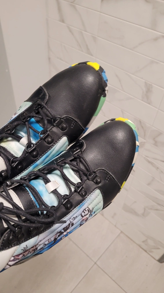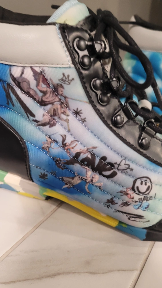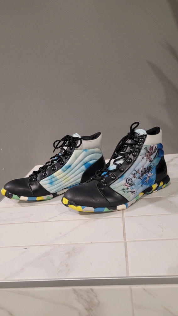 Black leather high top sneakers with blue and white tie dye pattern on the back of the shoe. The bottom of the shoe has a colourful camo pattern.