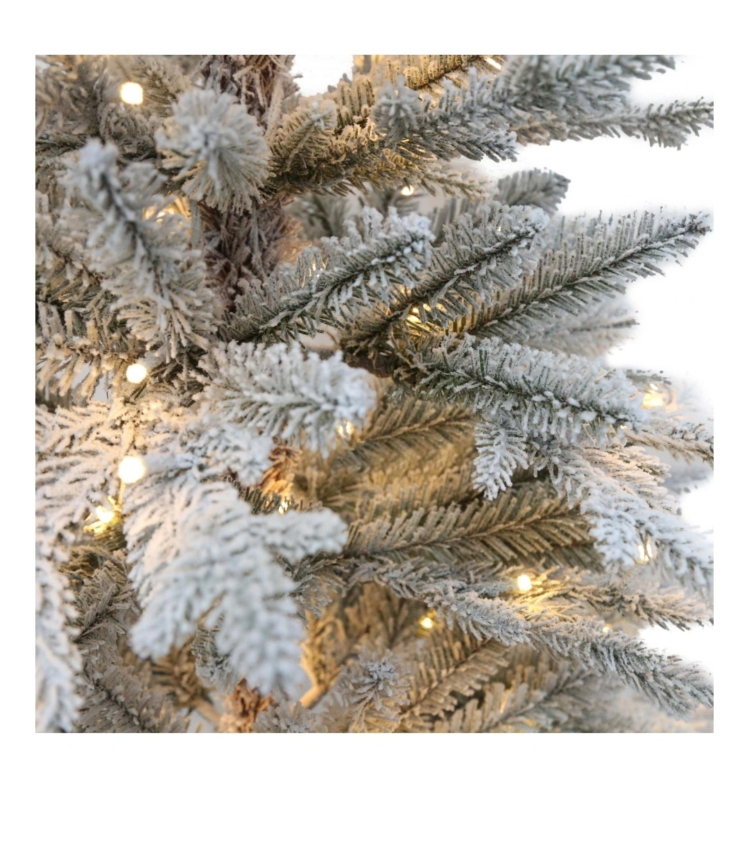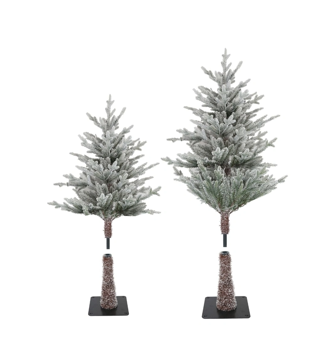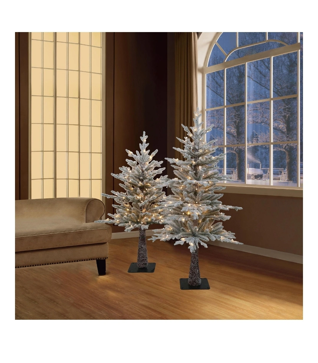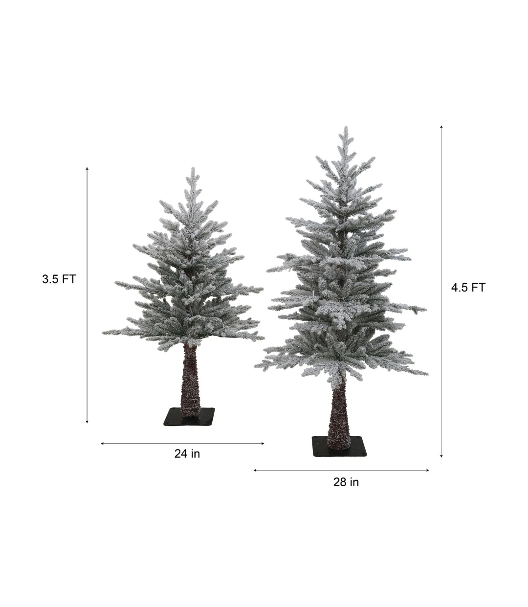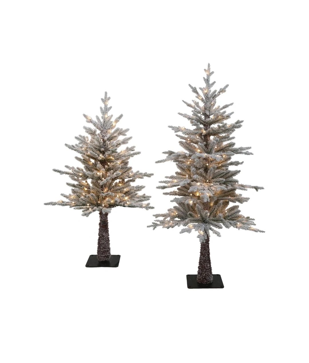 Set of two pre-lit flocked Christmas trees. One is 3.5 ft tall and the other is 4.5 ft tall. Both trees feature warm white LED lights.