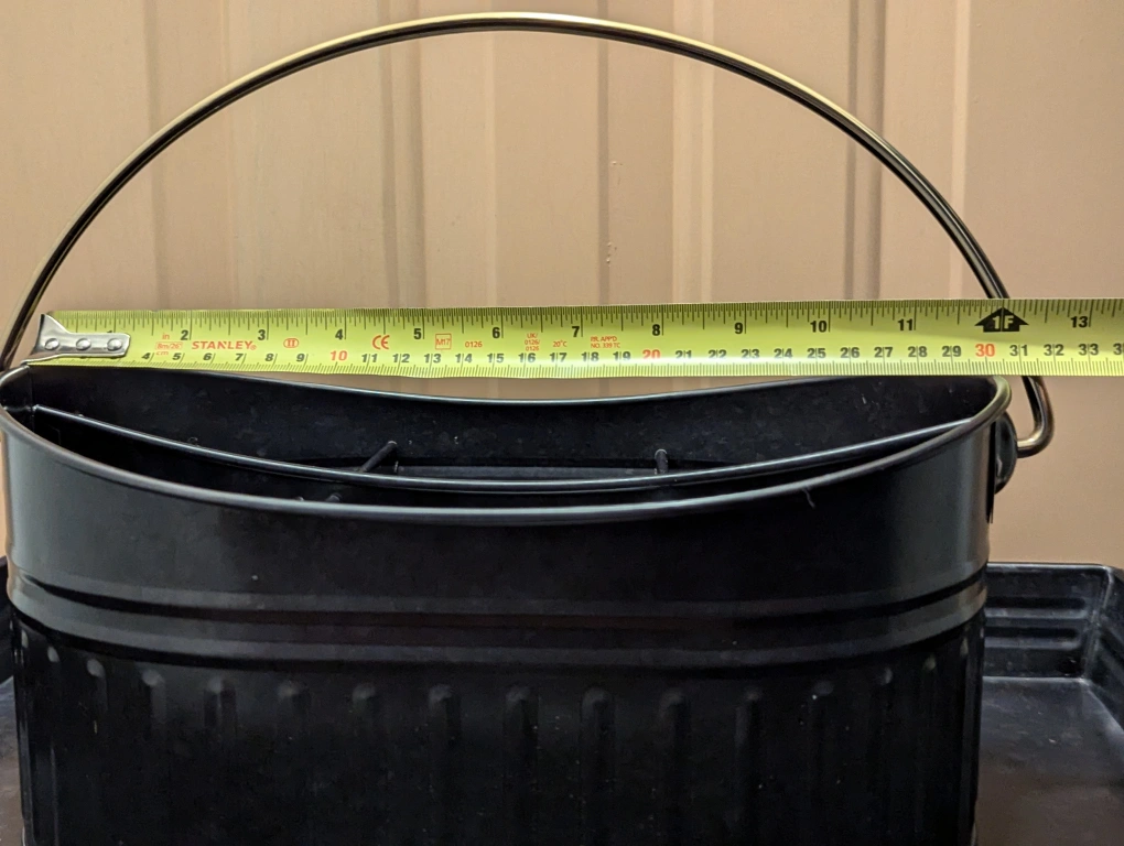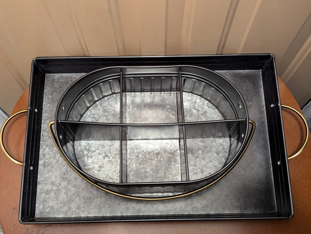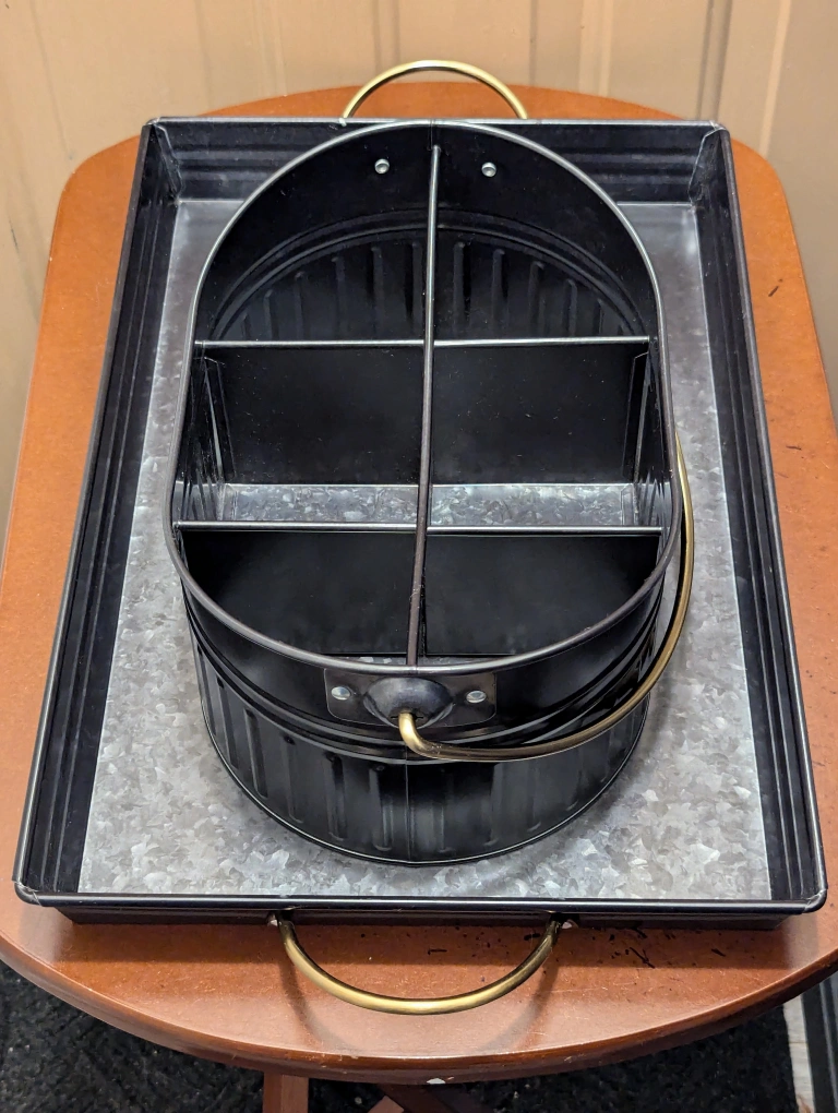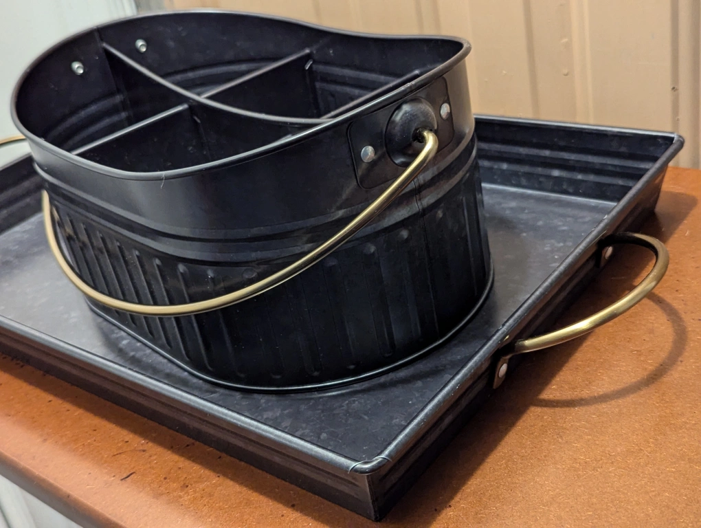 Gorgeous galvanized metal tray and utensil holder, both dark grey with gold handles.