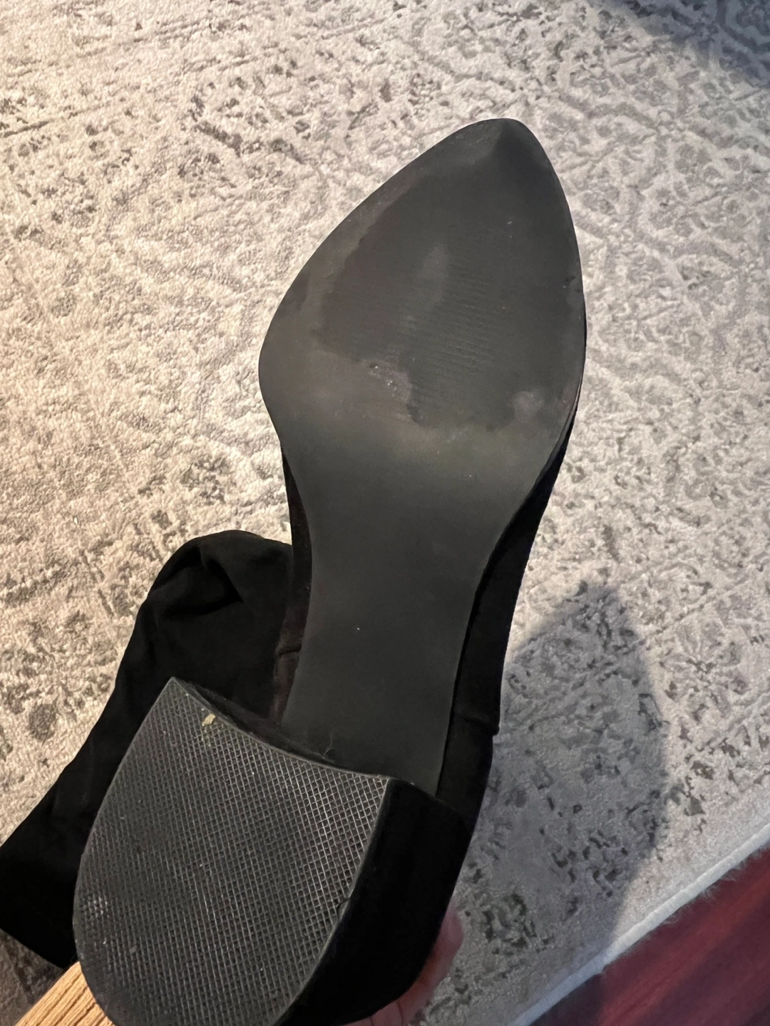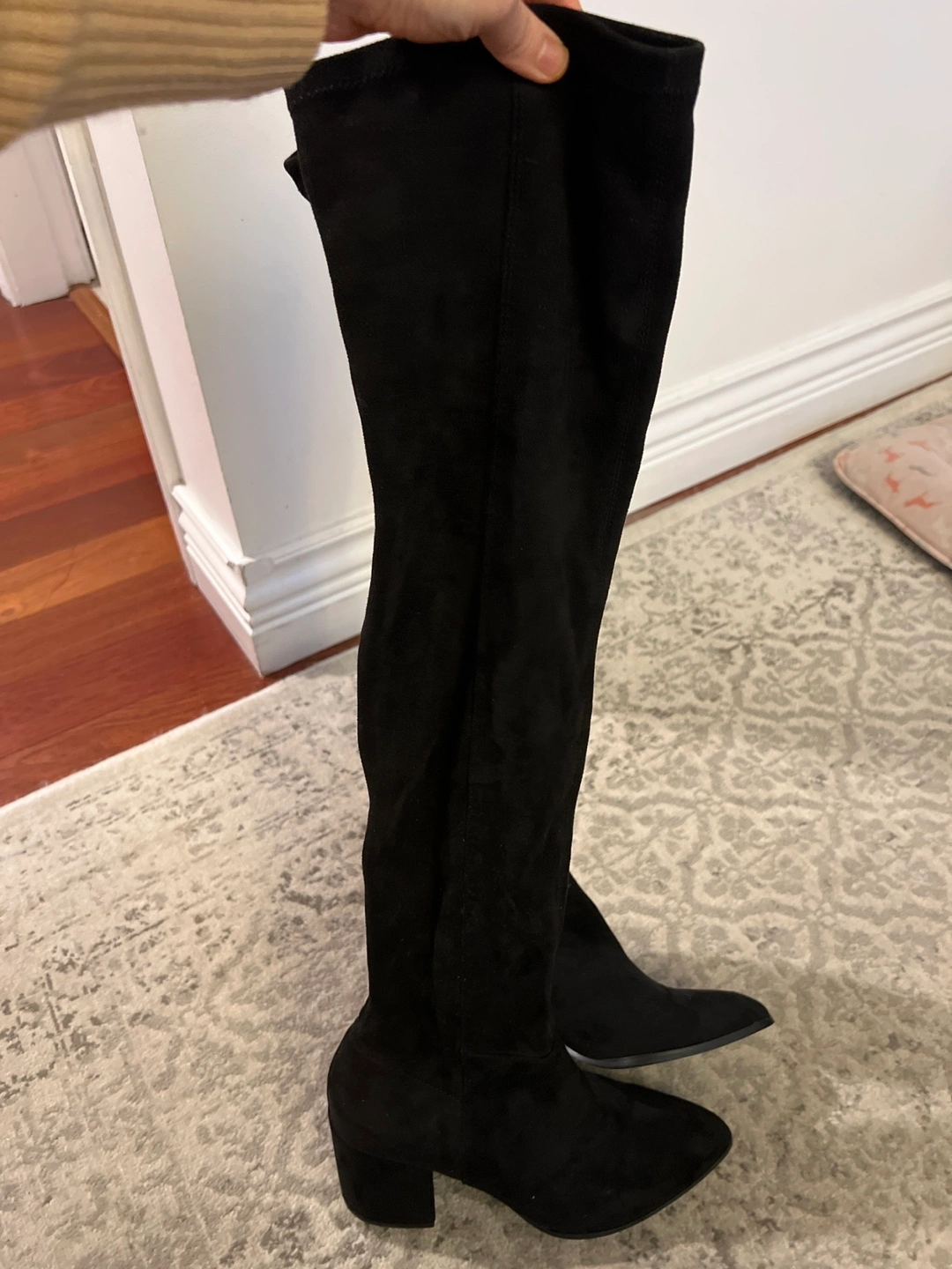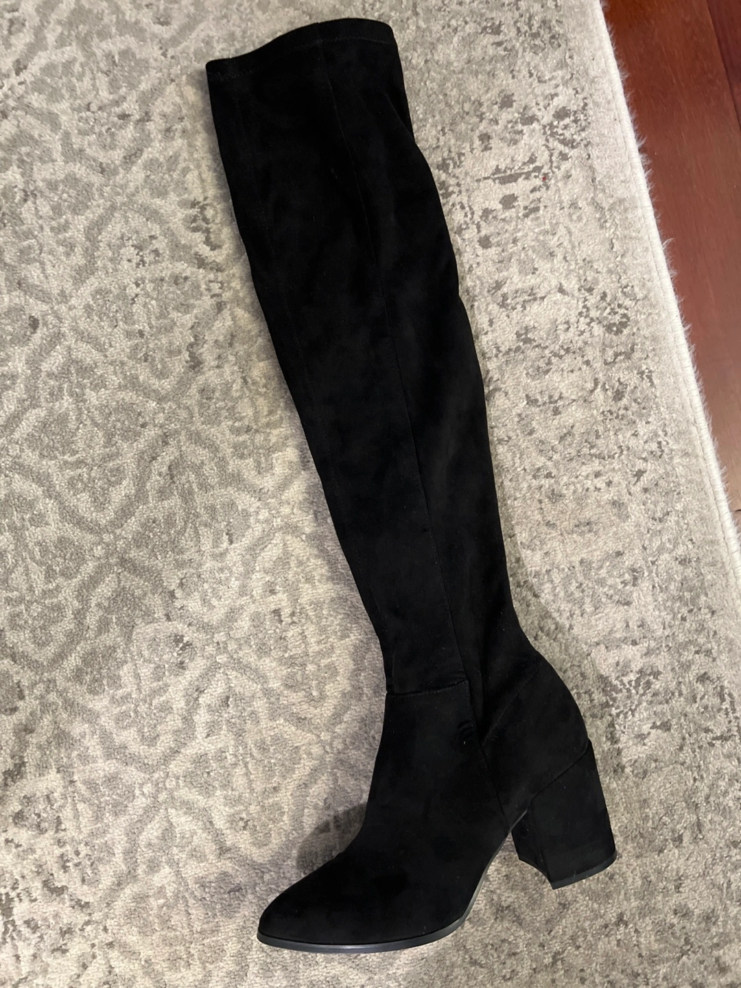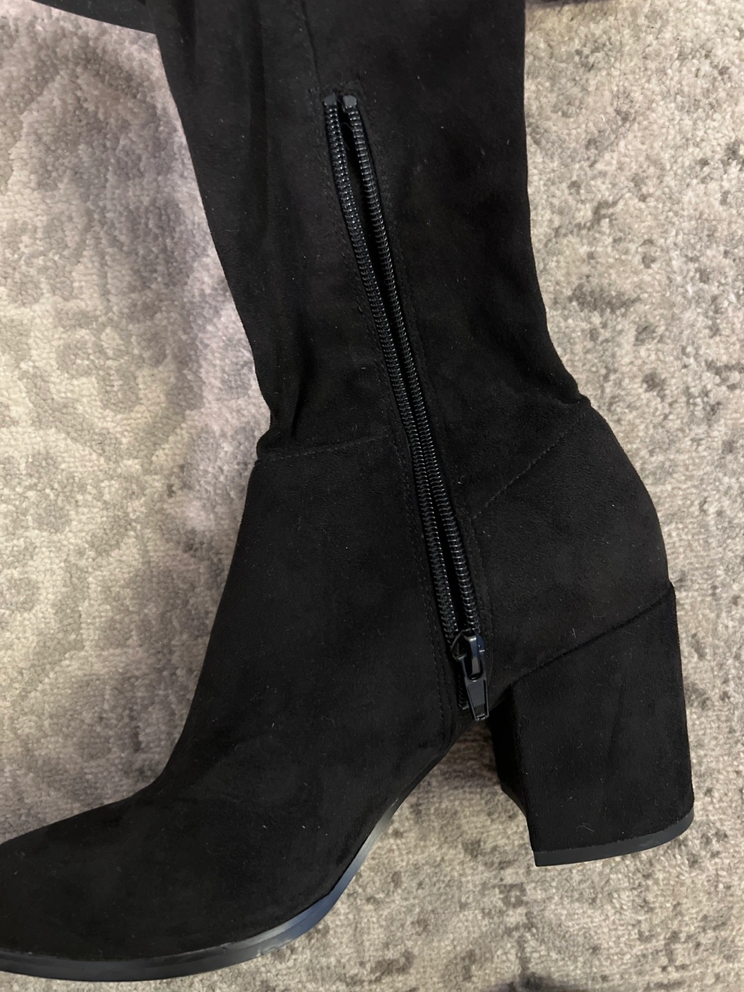 Black suede over-the-knee boots/ thigh high boots with a block heel. Size 7.5M. Side zipper closure. Worn once.