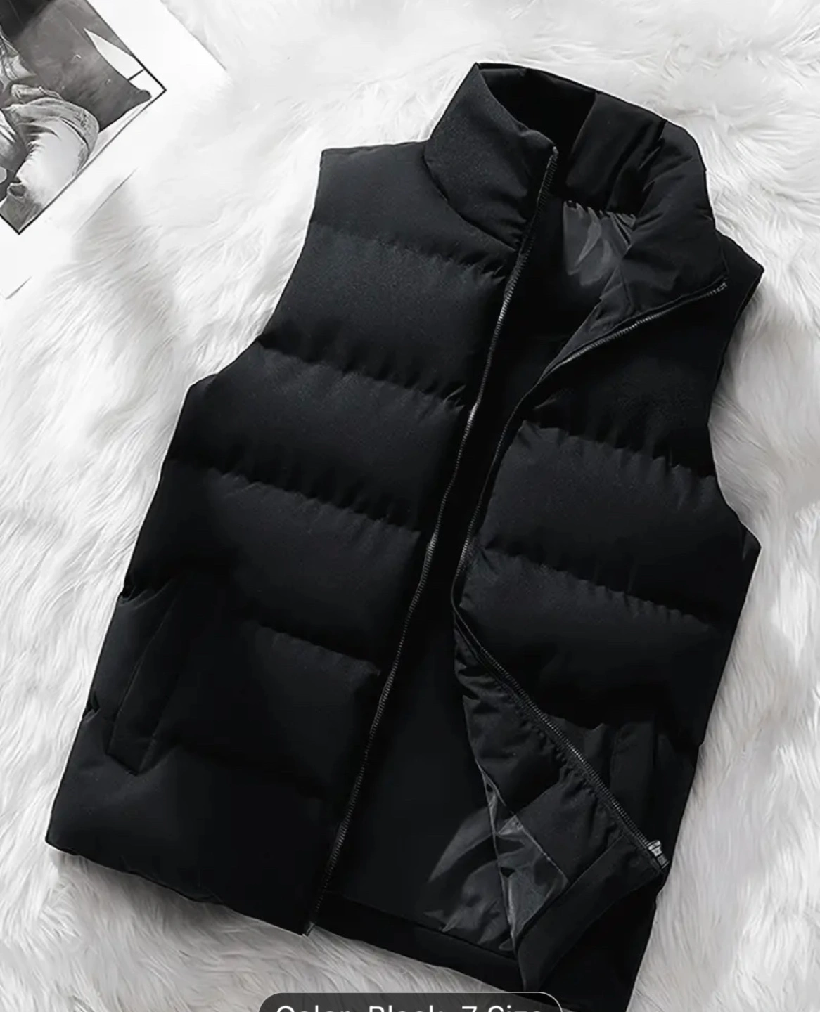 Black puffer vest with a zipper closure. Has a stand up collar.