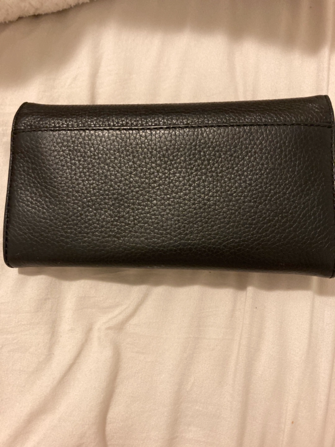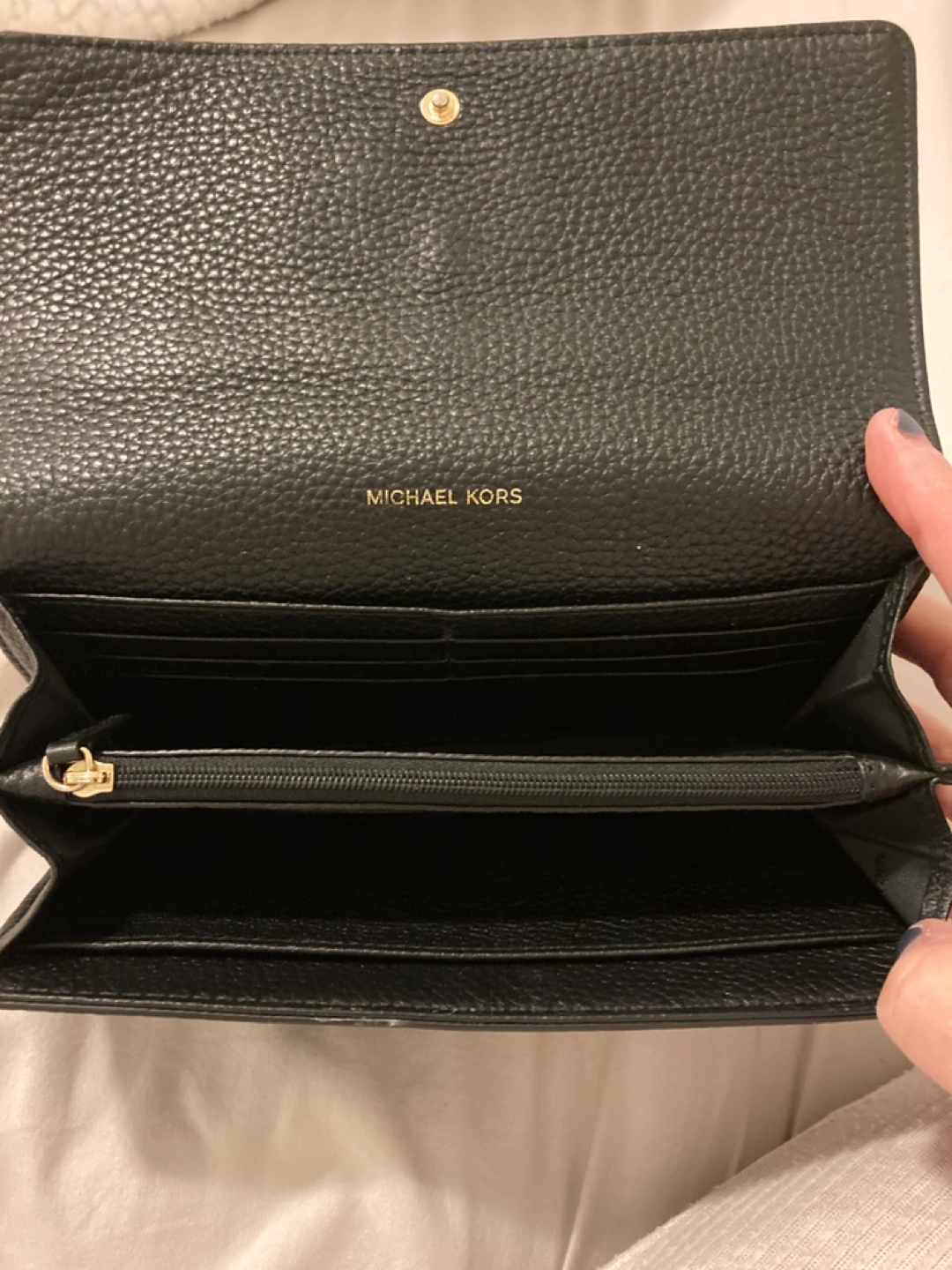 Black leather wallet with gold hardware. Has multiple card slots, bill compartments and a zippered coin pouch.