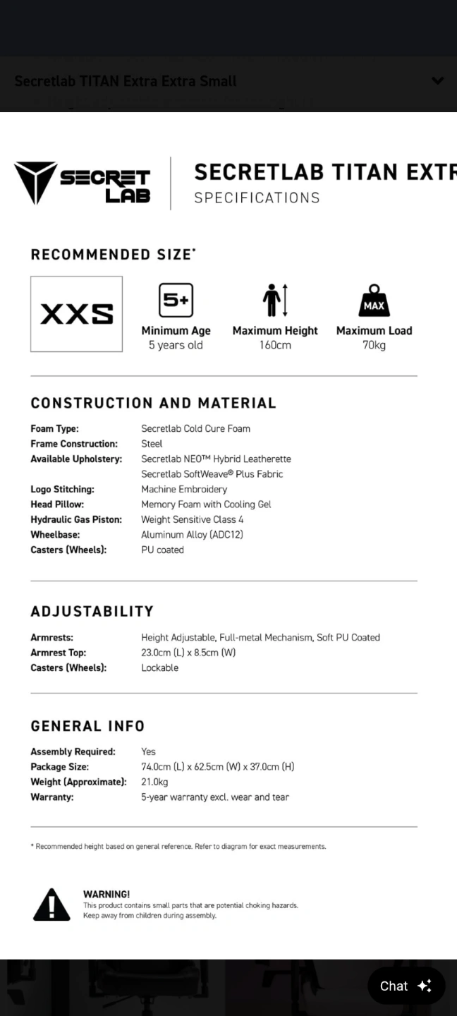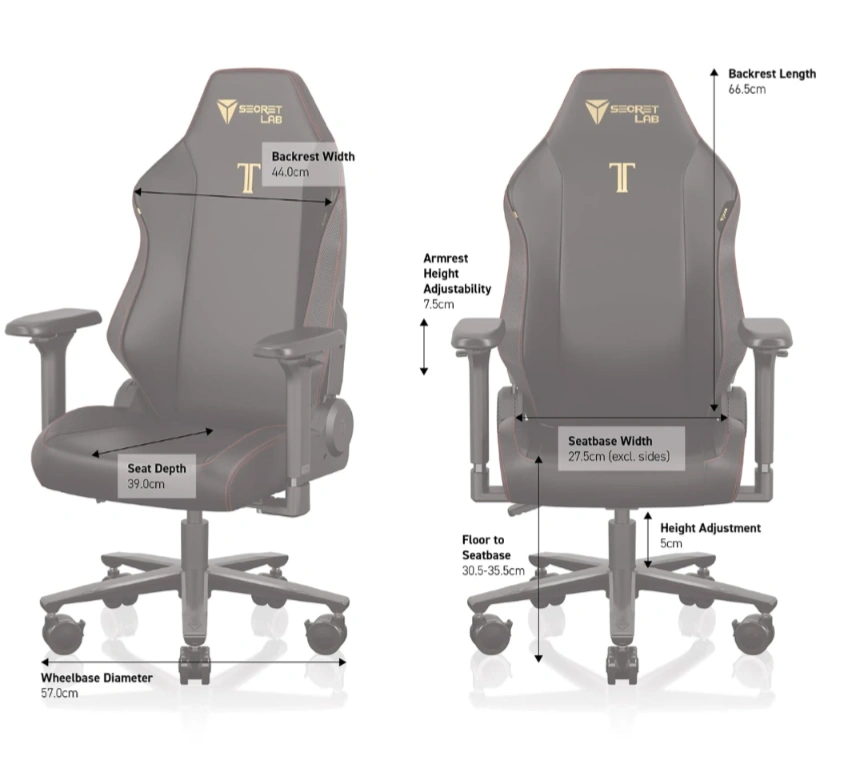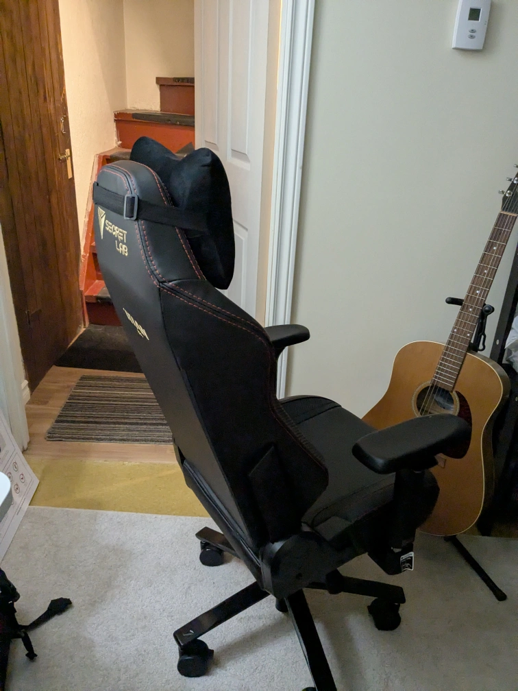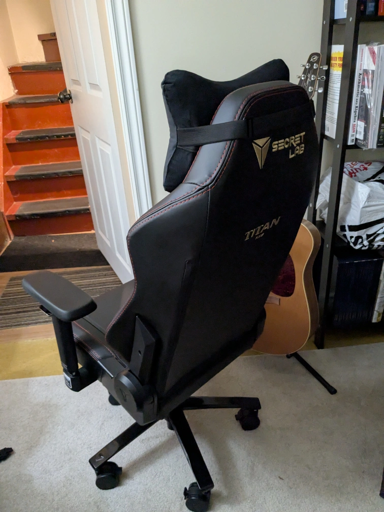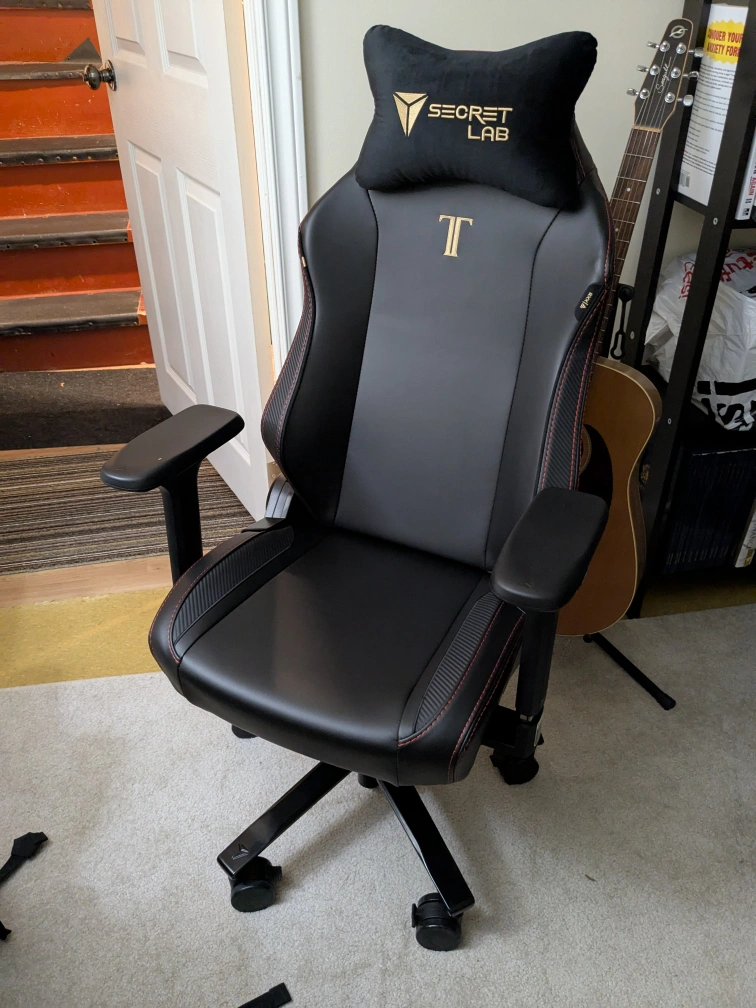 Black gaming chair with red stitching. Includes a headrest pillow. Adjustable height and armrests. Brand new, never used. Bought it but realized it is too small and they don't accept exchanges or refunds.