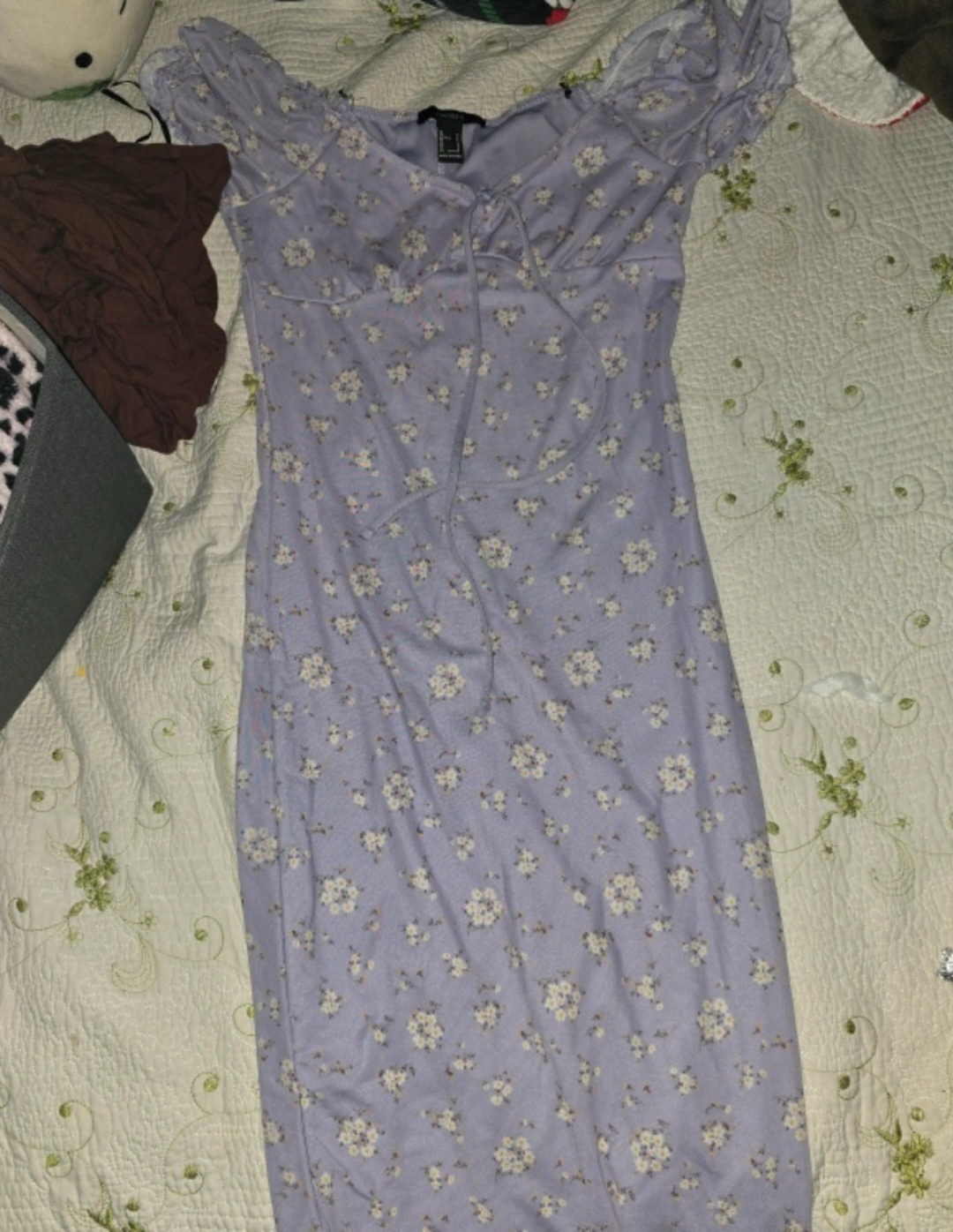 Purple floral midi dress with short sleeves and a tie at the neckline. Fitted dress.