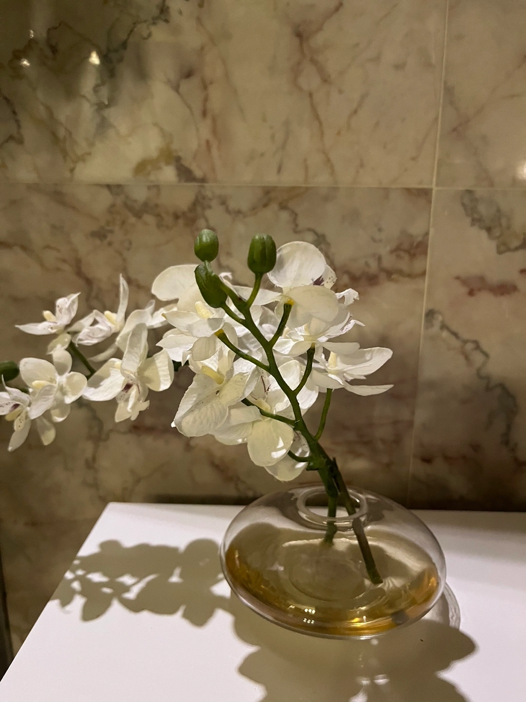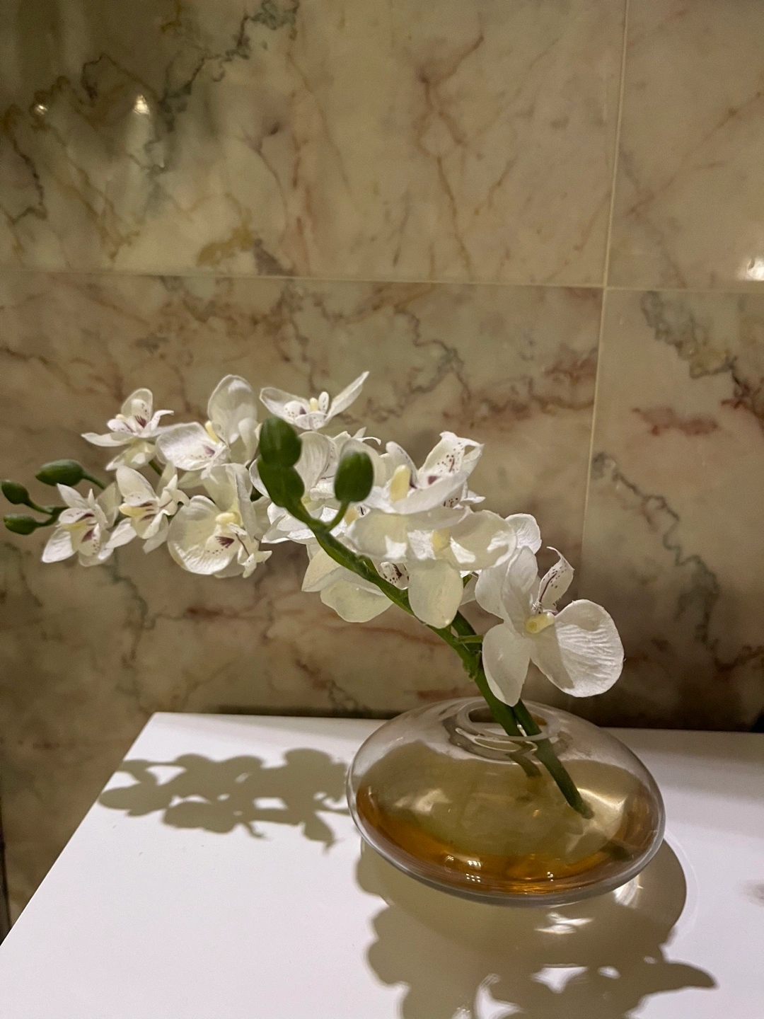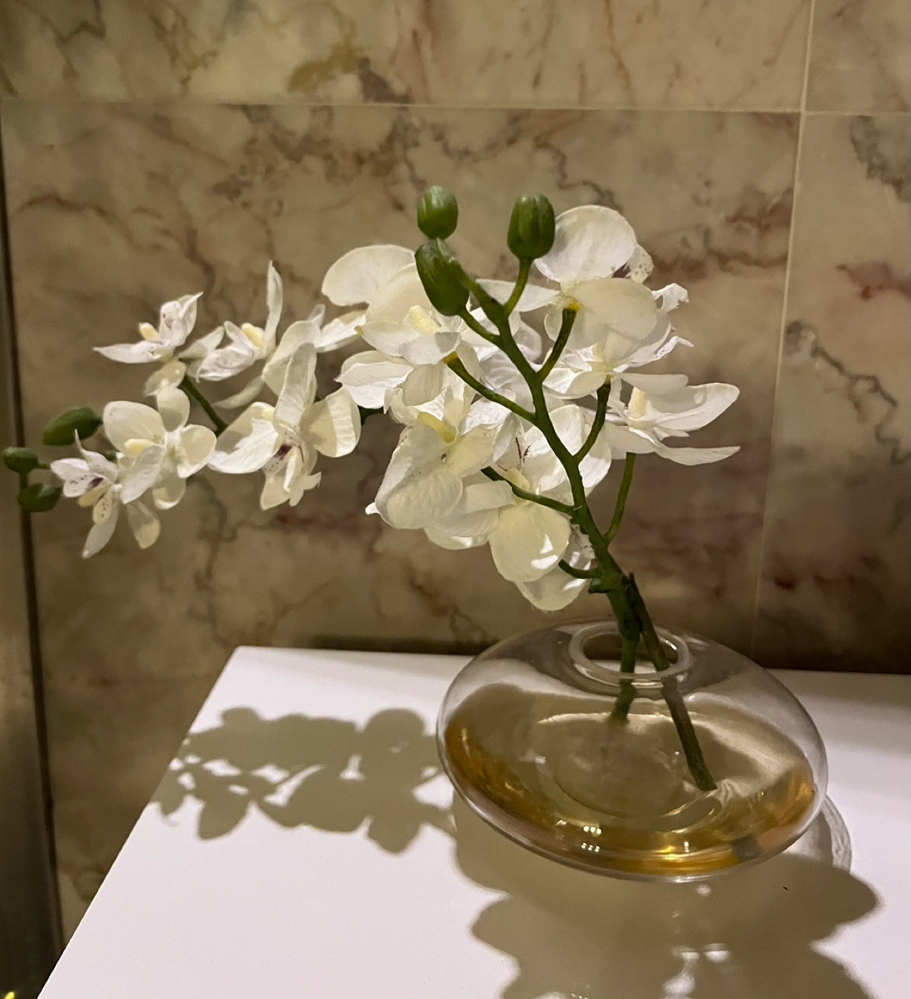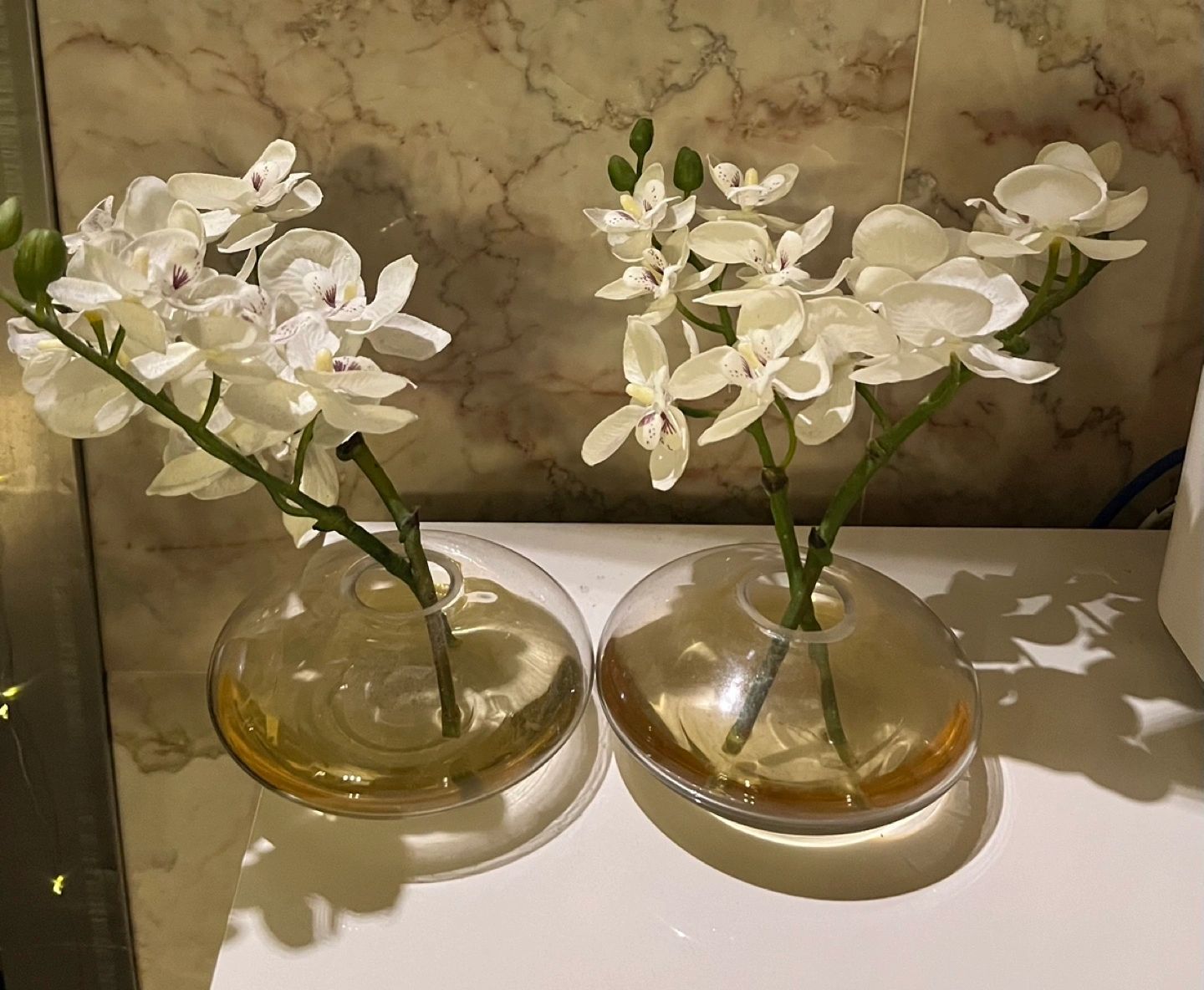 10Two faux orchid arrangements in clear glass vases with a gold tint. Perfect for adding a touch of elegance to any room.