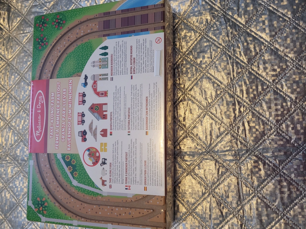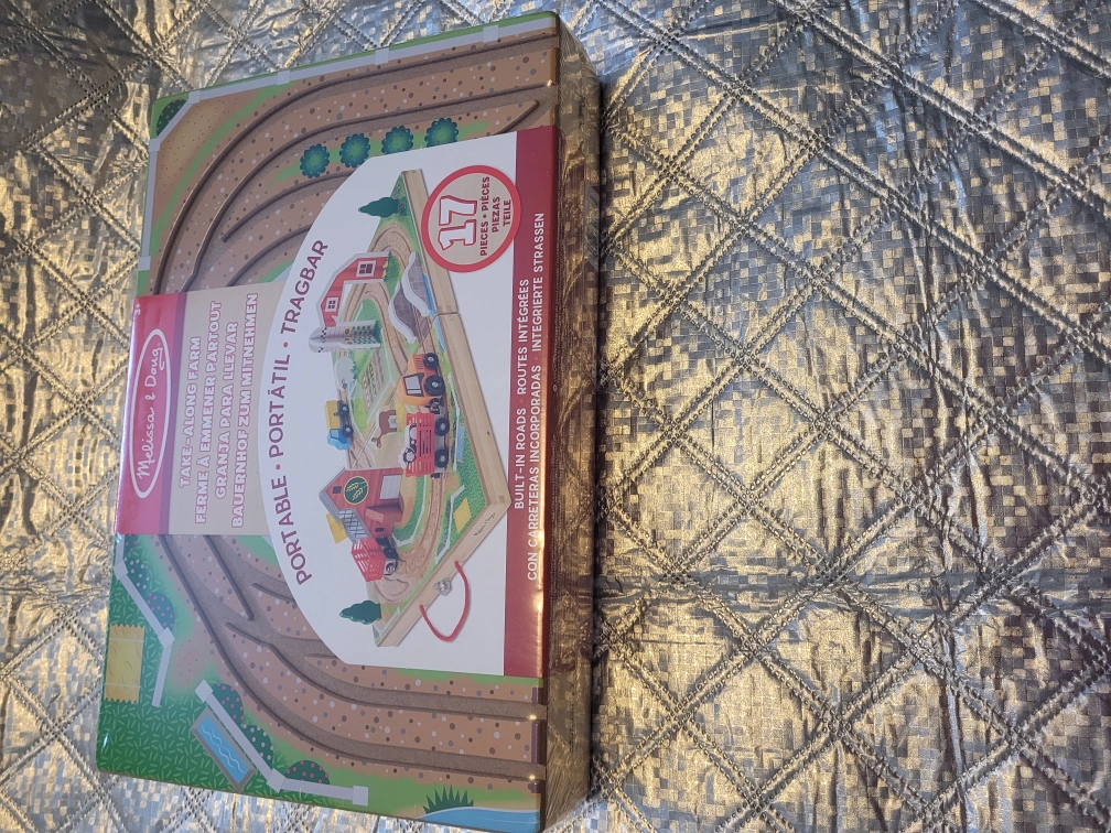 This Brand New 17-piece farm play set with wooden storage case that unfolds to create playing surface with built-in road tracks
