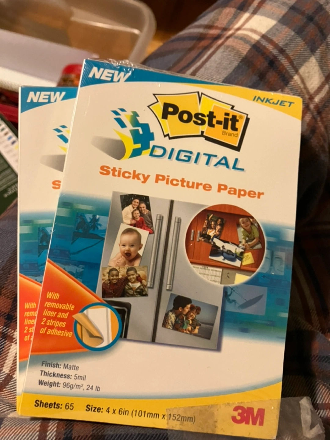 New, 65 sheets. 4x6in (101mm x 152mm). Matte finish, 5mil thickness, 96g/m², 24lb. Inkjet compatible. Removable liner and 2 stripes of adhesive. Made for printing pictures at home!