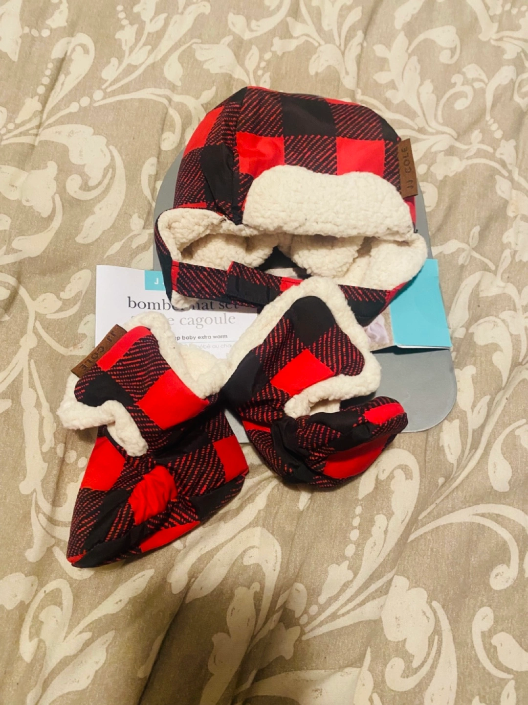 Red and black plaid baby hat and booties. Lined with soft fleece. Size 0-6 months