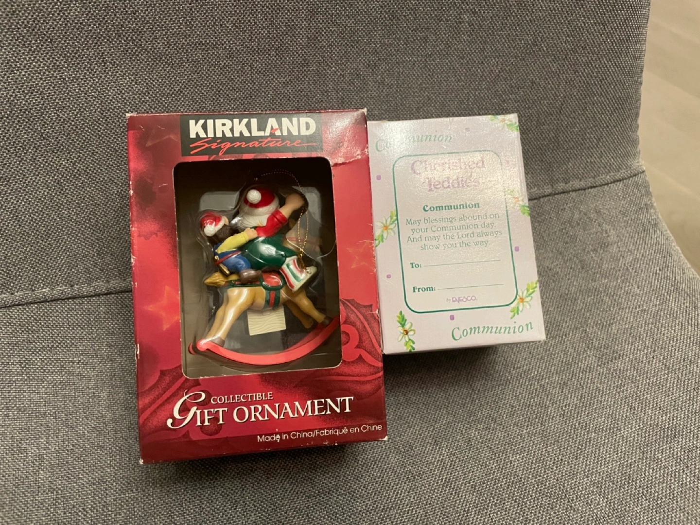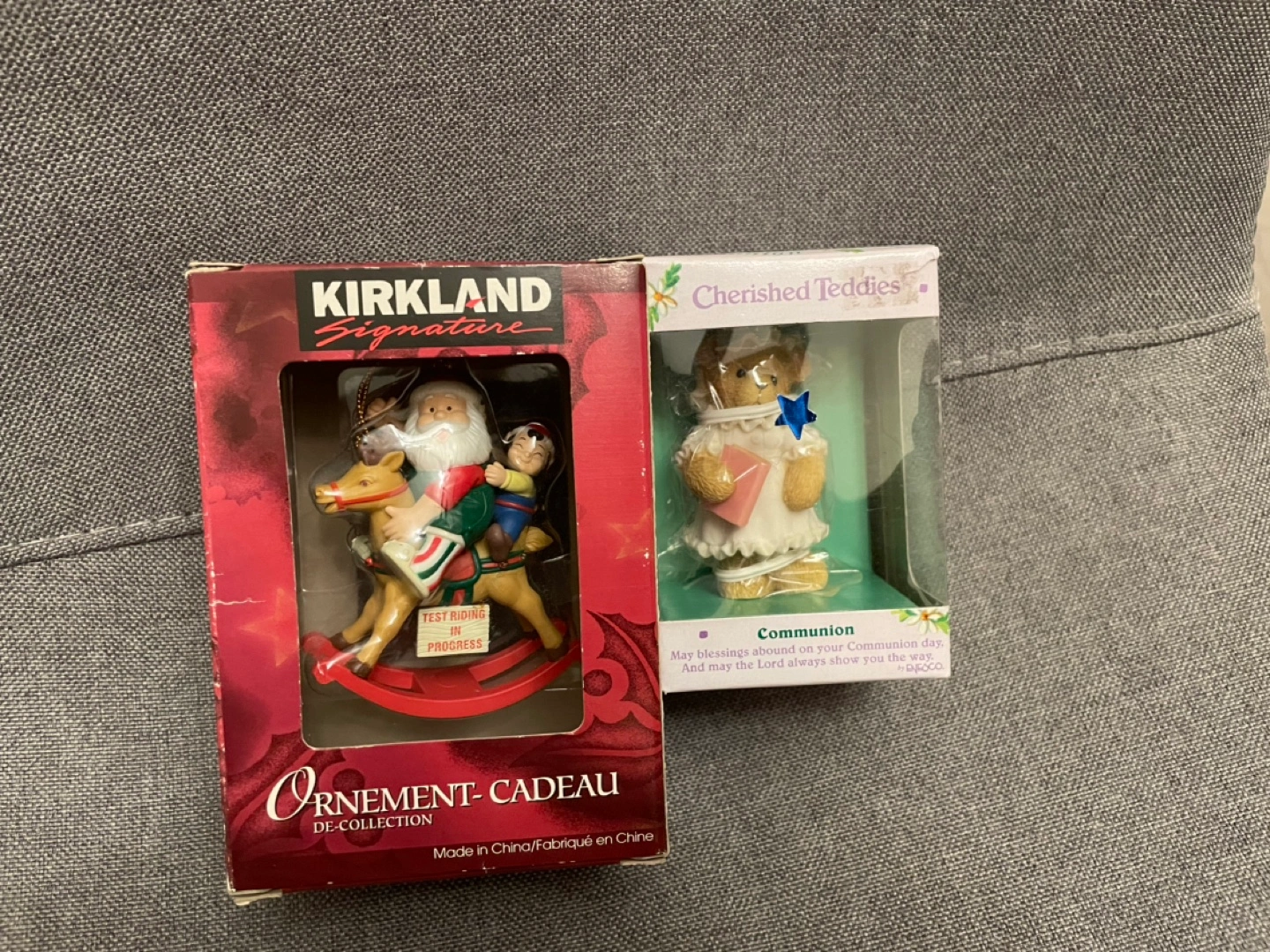 Two Christmas ornaments. One is a Kirkland Signature Santa on a rocking horse with a child ornament and the other is a Cherished Teddies bear in a pink dress. Both are in their original packaging. Pick up at 7488 Byrnepark walk Burnaby