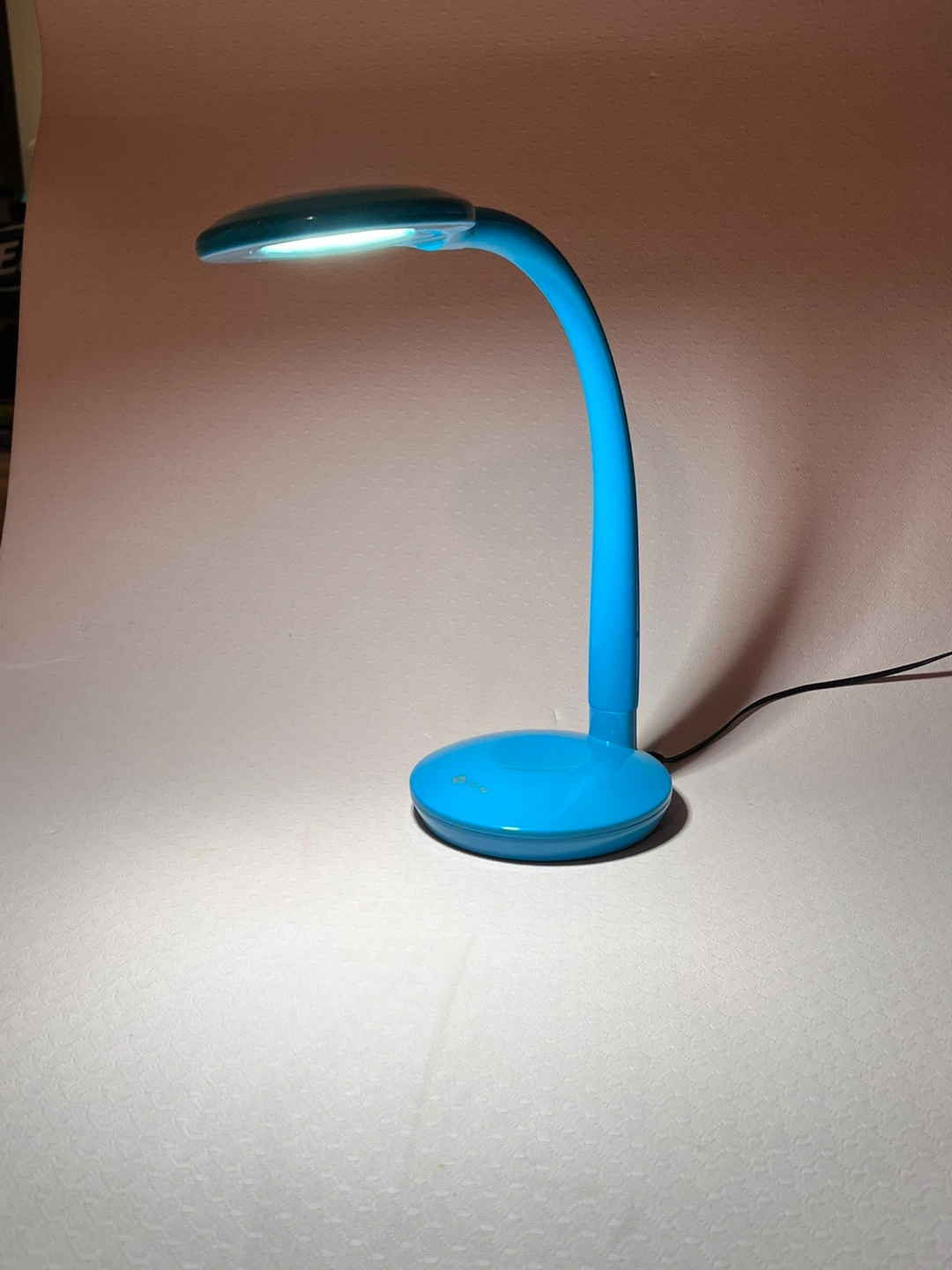 Blue desk lamp with flexible arm and a round base. It has a white LED light. It is plugged in with a cord.