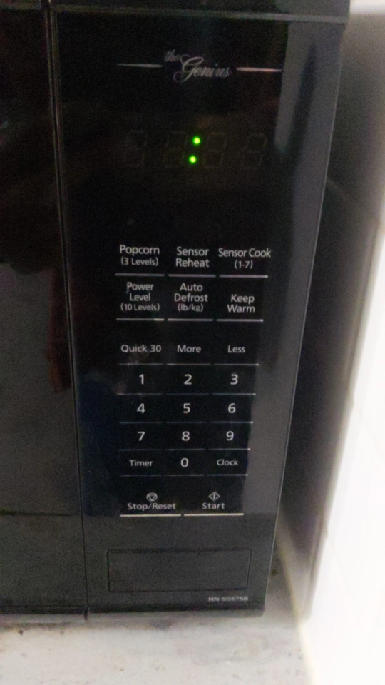 Black microwave with digital controls. Features popcorn, sensor reheat, sensor cook, power levels, auto defrost, keep warm, and timer functions.