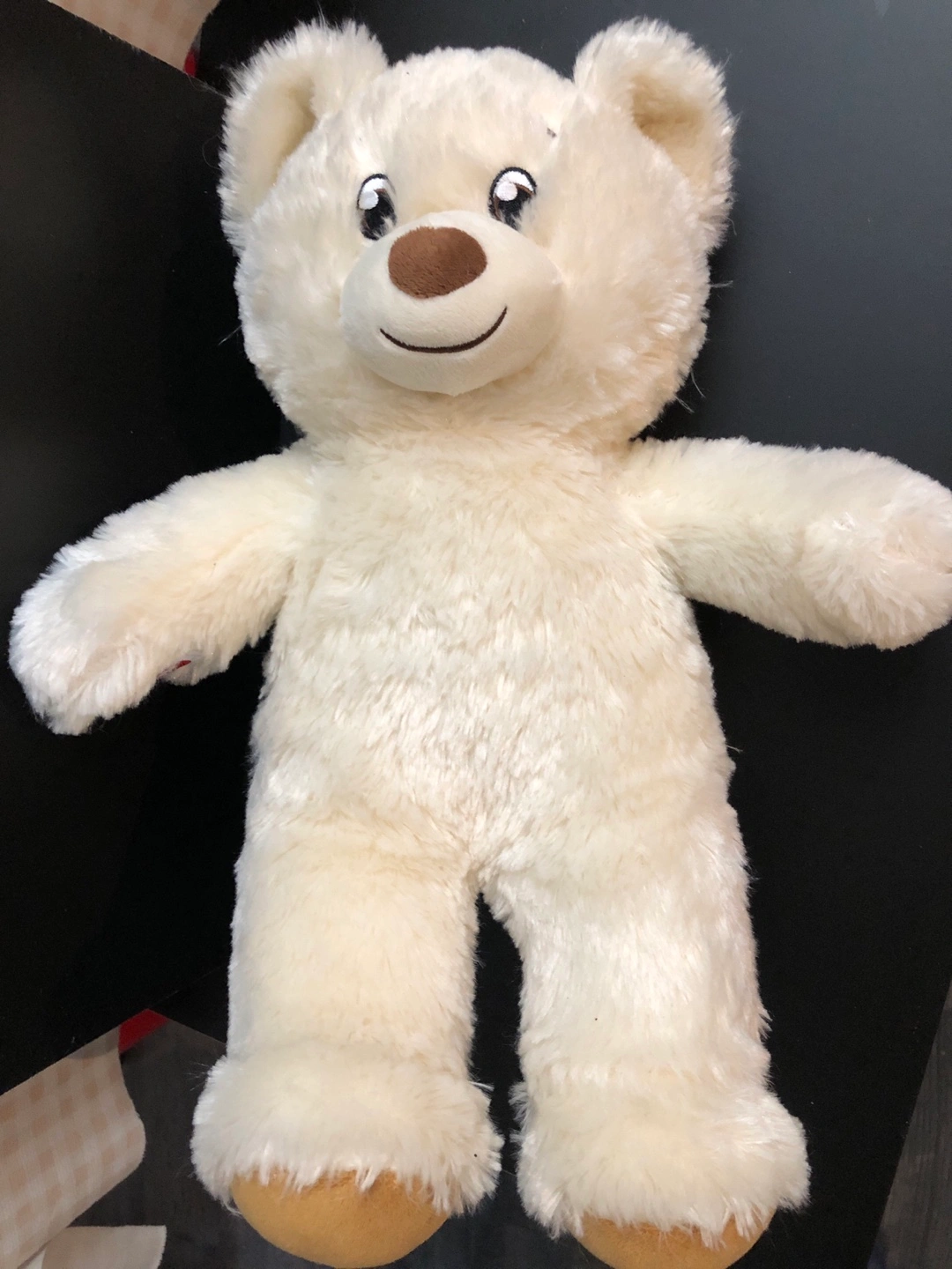 White plush teddy bear with brown nose and black eyes. Has tan coloured feet.