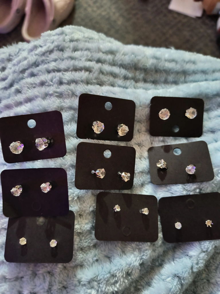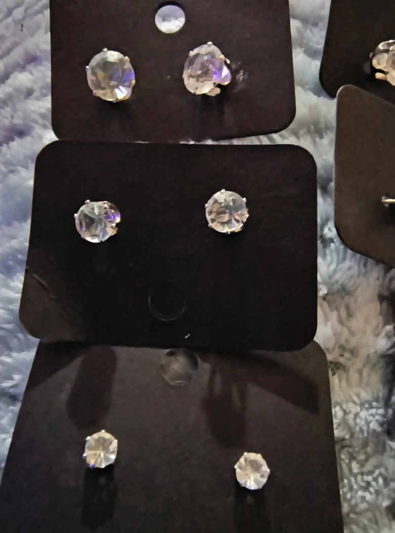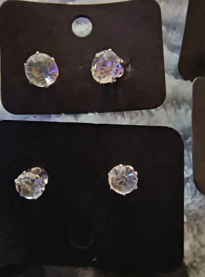 Set of clear crystal stud earrings. Silver tone metal.
