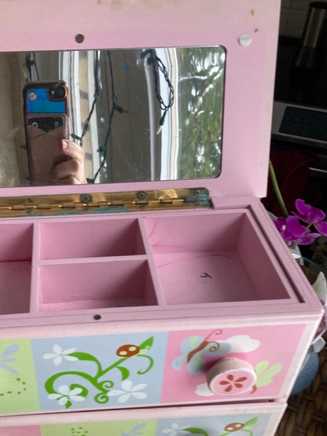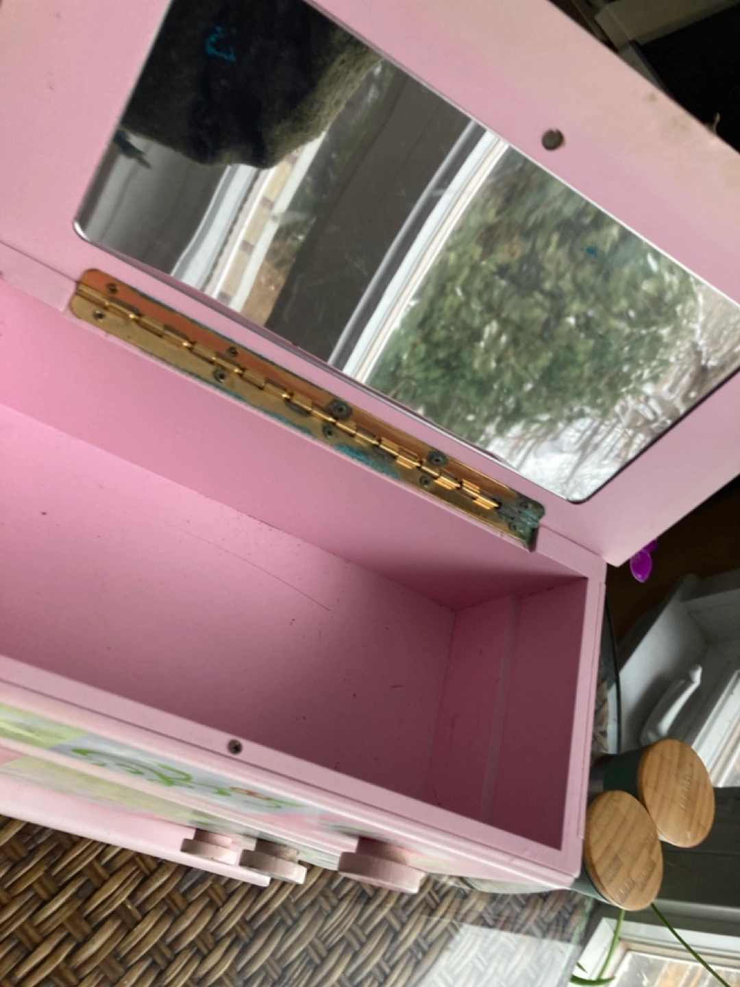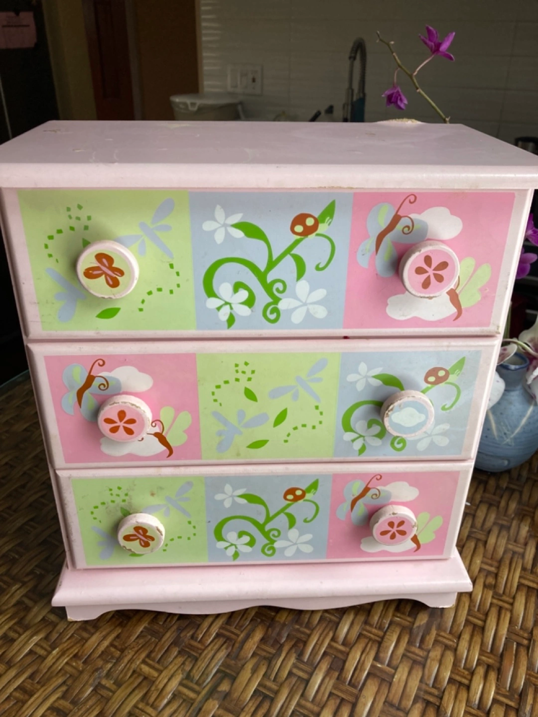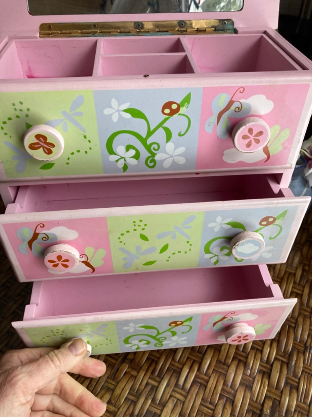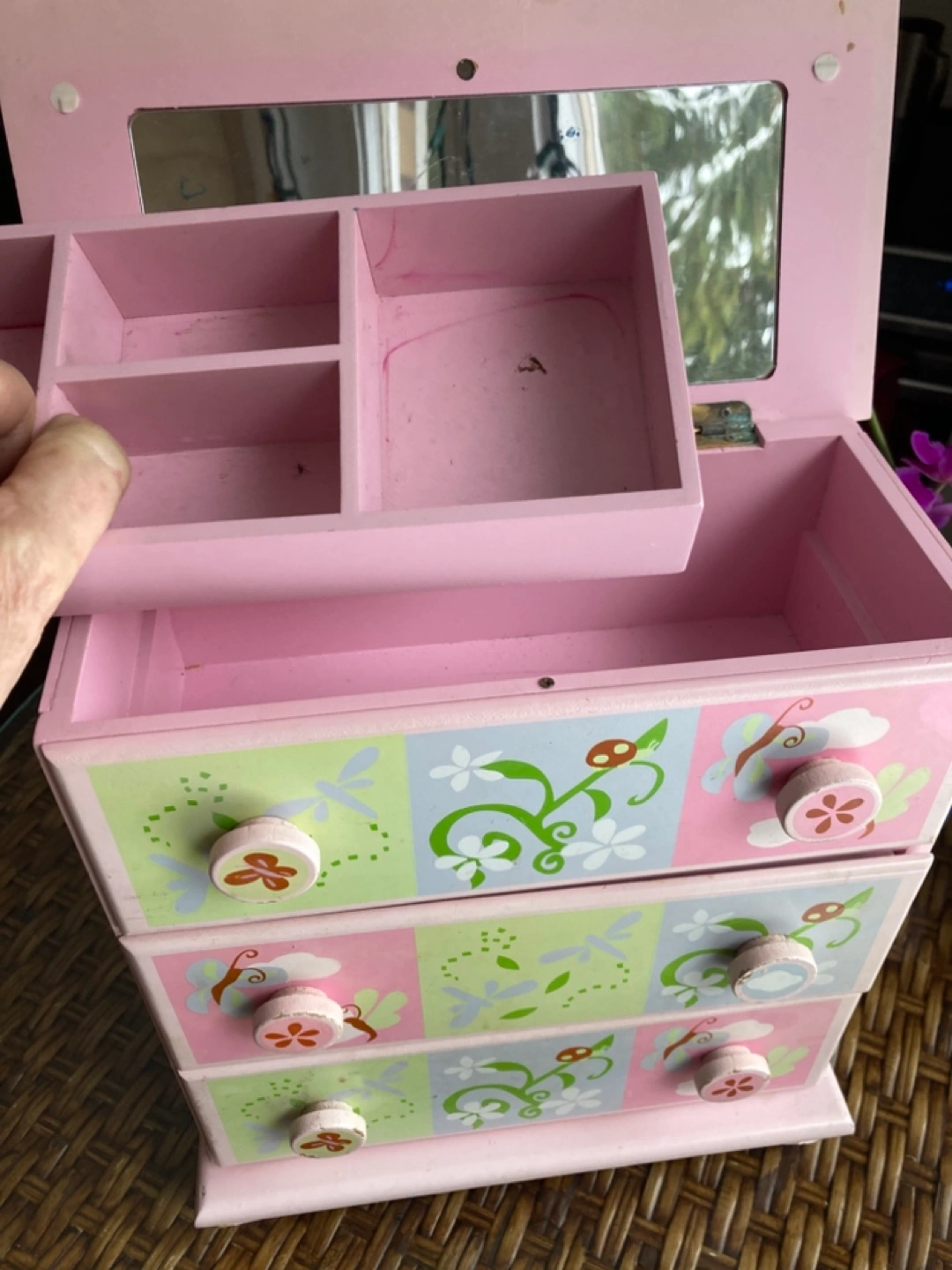 Pink wooden jewellery box with mirror and three drawers. Can also be repainted and remove the mirror to make this a nifty toolbox. Decorated with butterflies and flowers. Slight wear and tear. The box measures approximately 15 cm tall x 20 cm wide x 15 cm deep. Everything is functional, but it’s not in new condition.