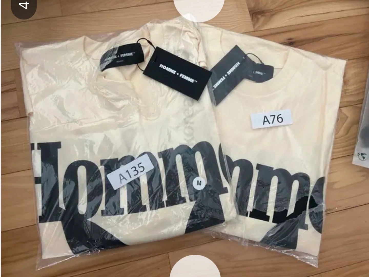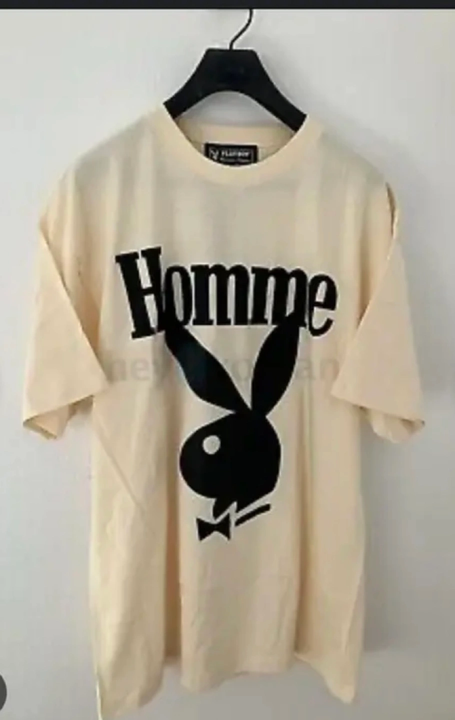 Cream colored t-shirt with black Playboy bunny logo and Homme text. Size S