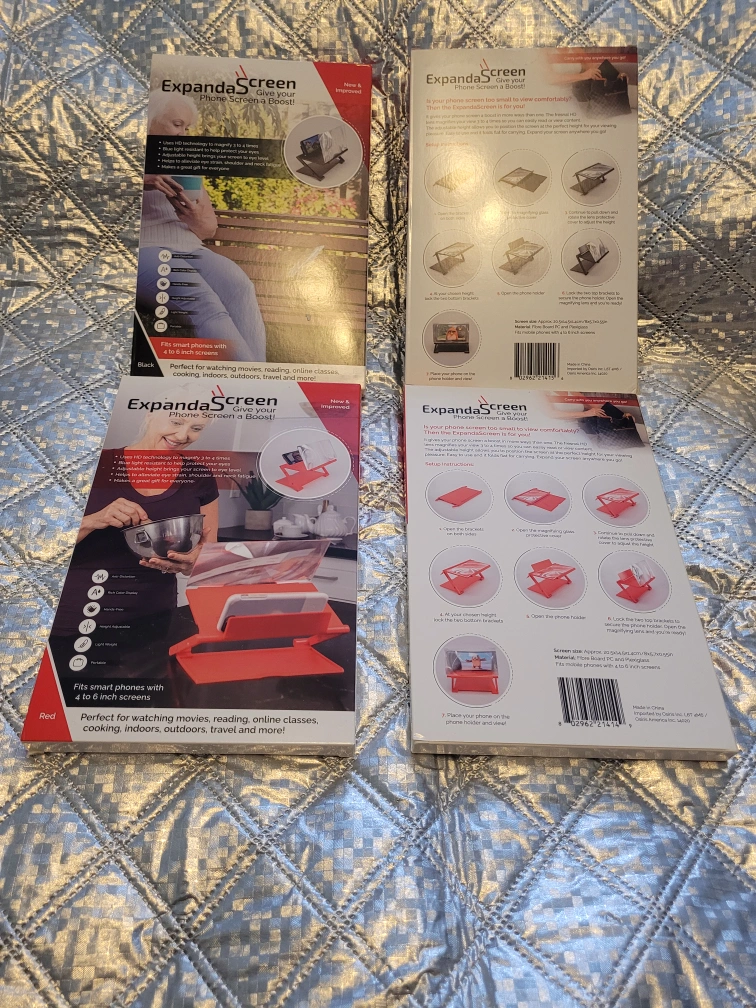 Brand New Cell Phone Screen Expander & Magnifiers Uses HD technology to magnify cell phone screen size 3 to 4 times. Blue light is resistant to help protect your eyes. Adjustable height brings your screen to eye level. Helps to alleviate eye strain, shoulder and neck fatique. This gadget comes in two colors: red and black. Price $10.00