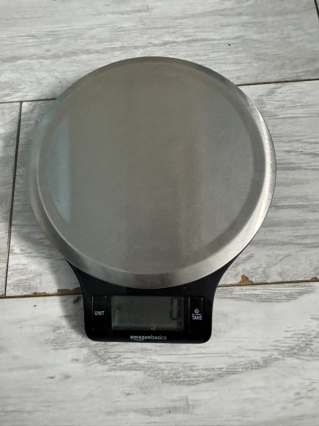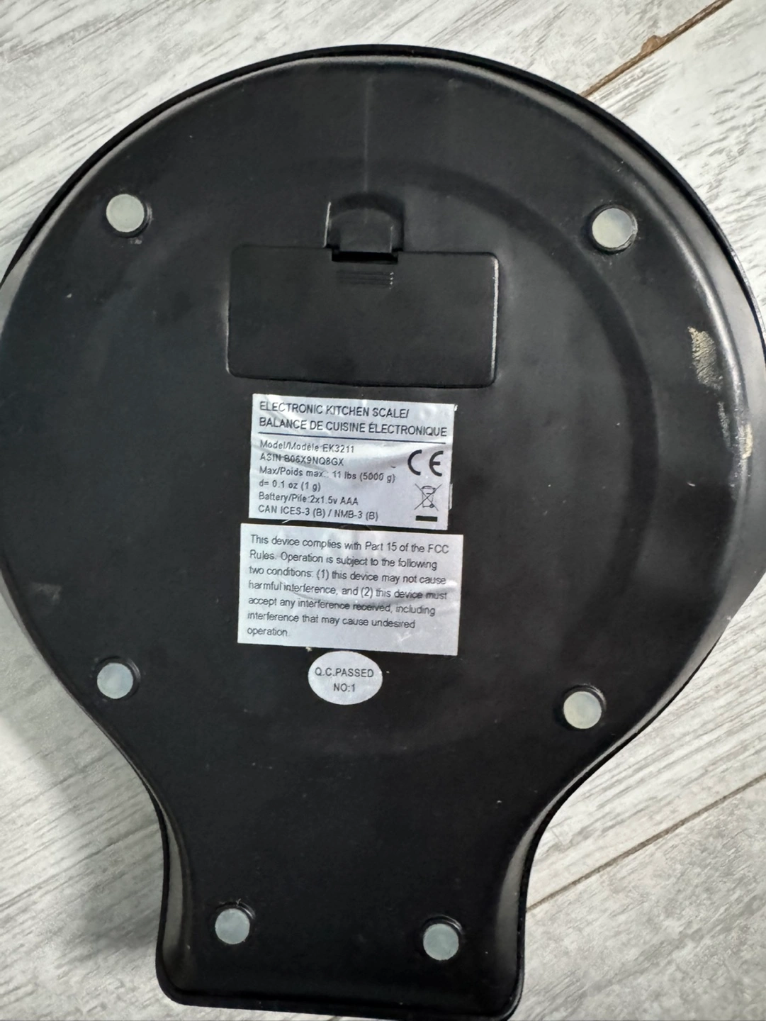 Electronic kitchen scale. Measures up to 11 lbs (5000 g). Includes a battery compartment and runs on 2 AAA batteries.