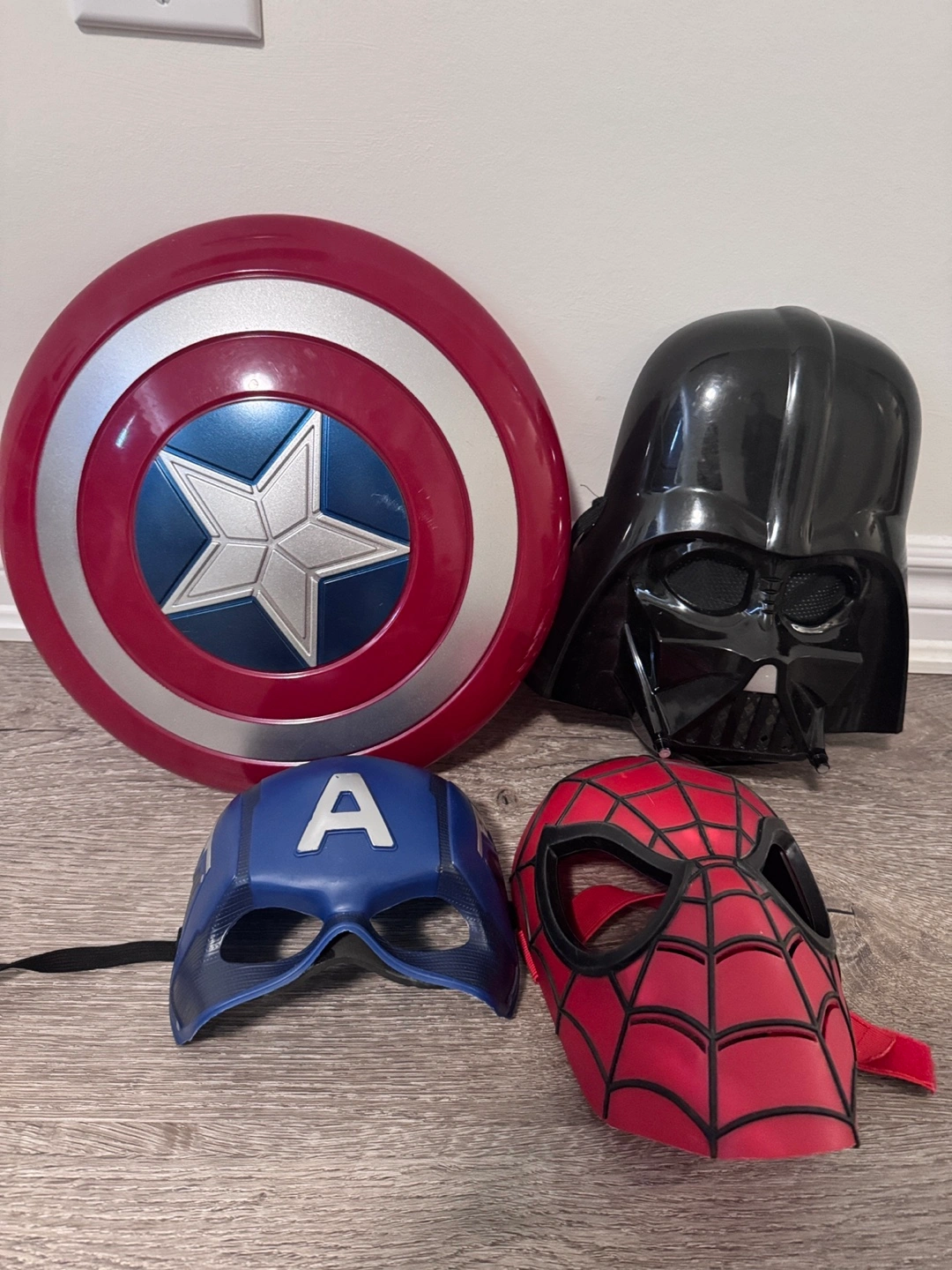 Set of 3 masks: Captain America mask and shield , Darth Vader, and Spiderman. All masks are in good condition