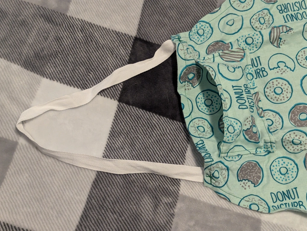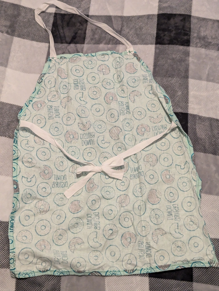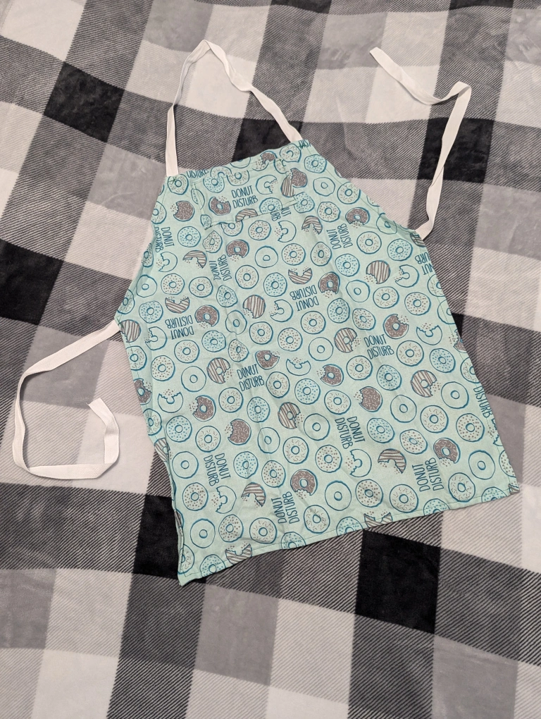 Pale blue-greem apron with donut pattern and small pocket on the front. Tie straps for waist, fixed neck strap.