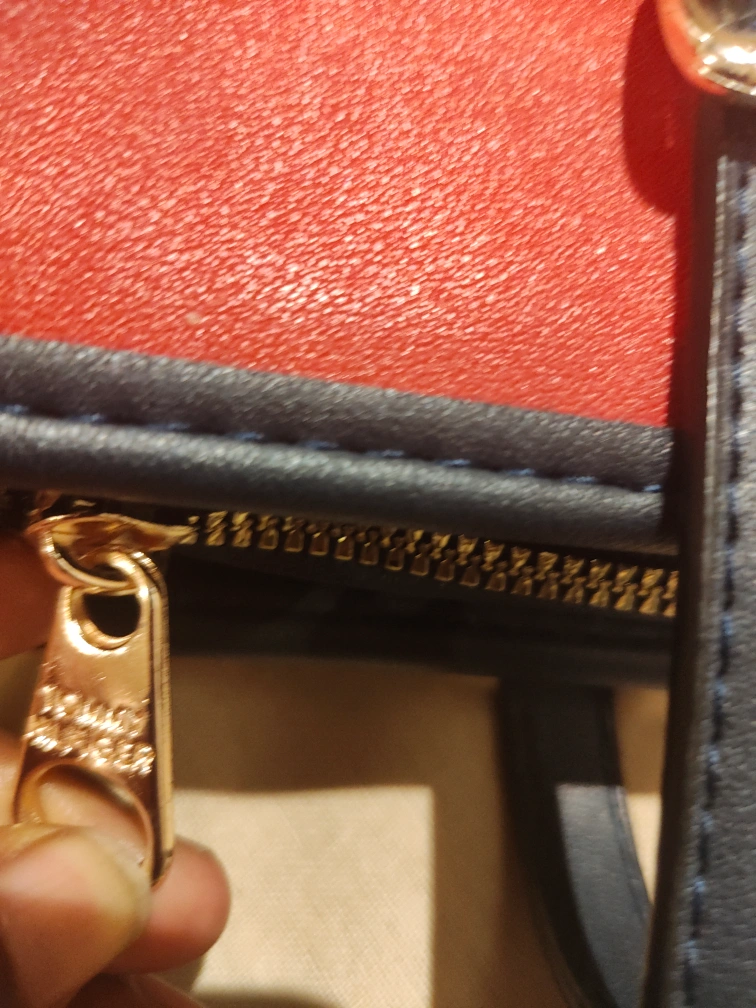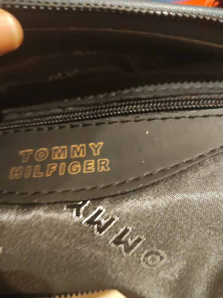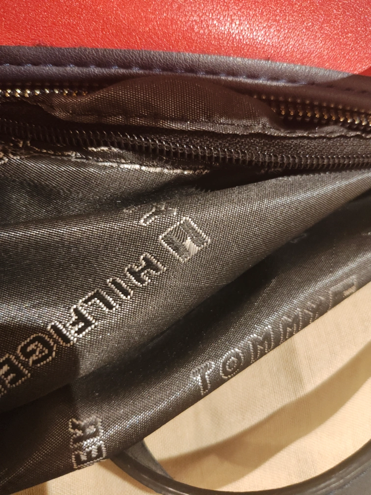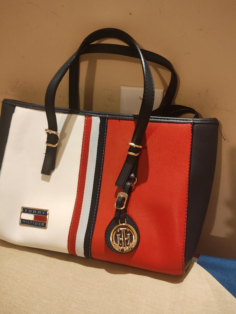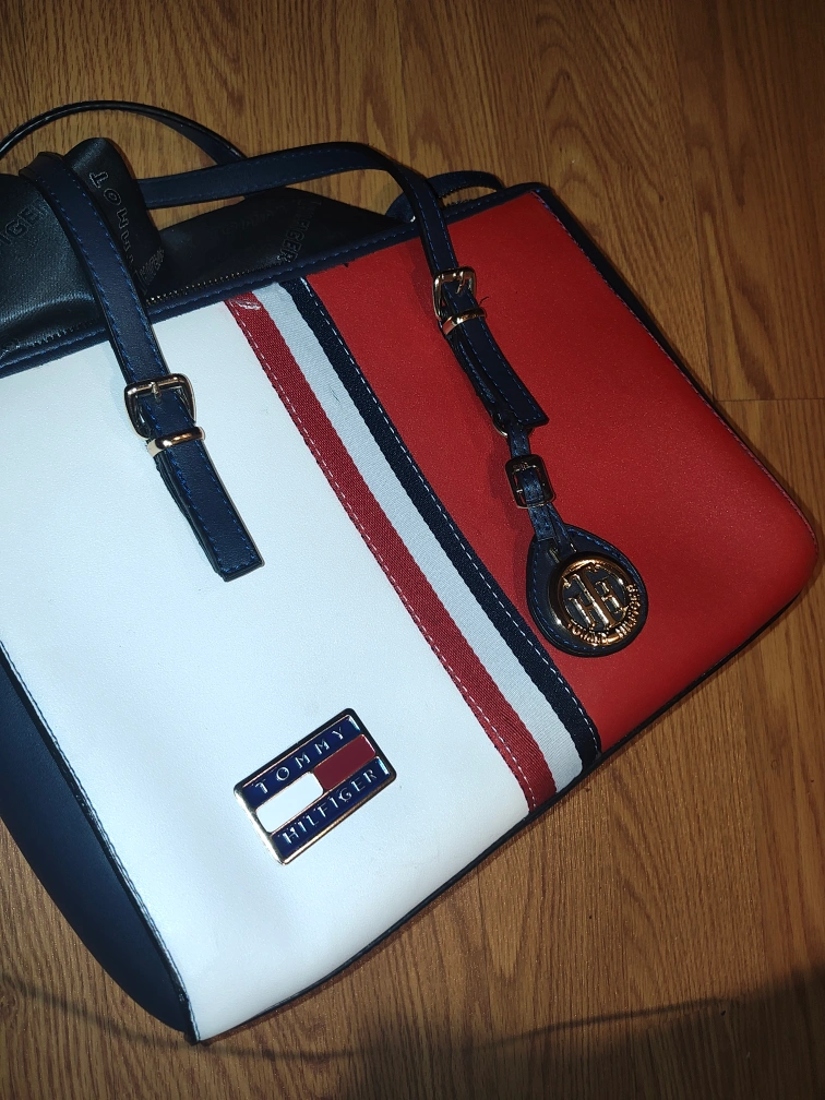 137Red, white and blue handbag with gold coloured hardware. Features a zipper closure and a Tommy Hilfiger logo on the front.