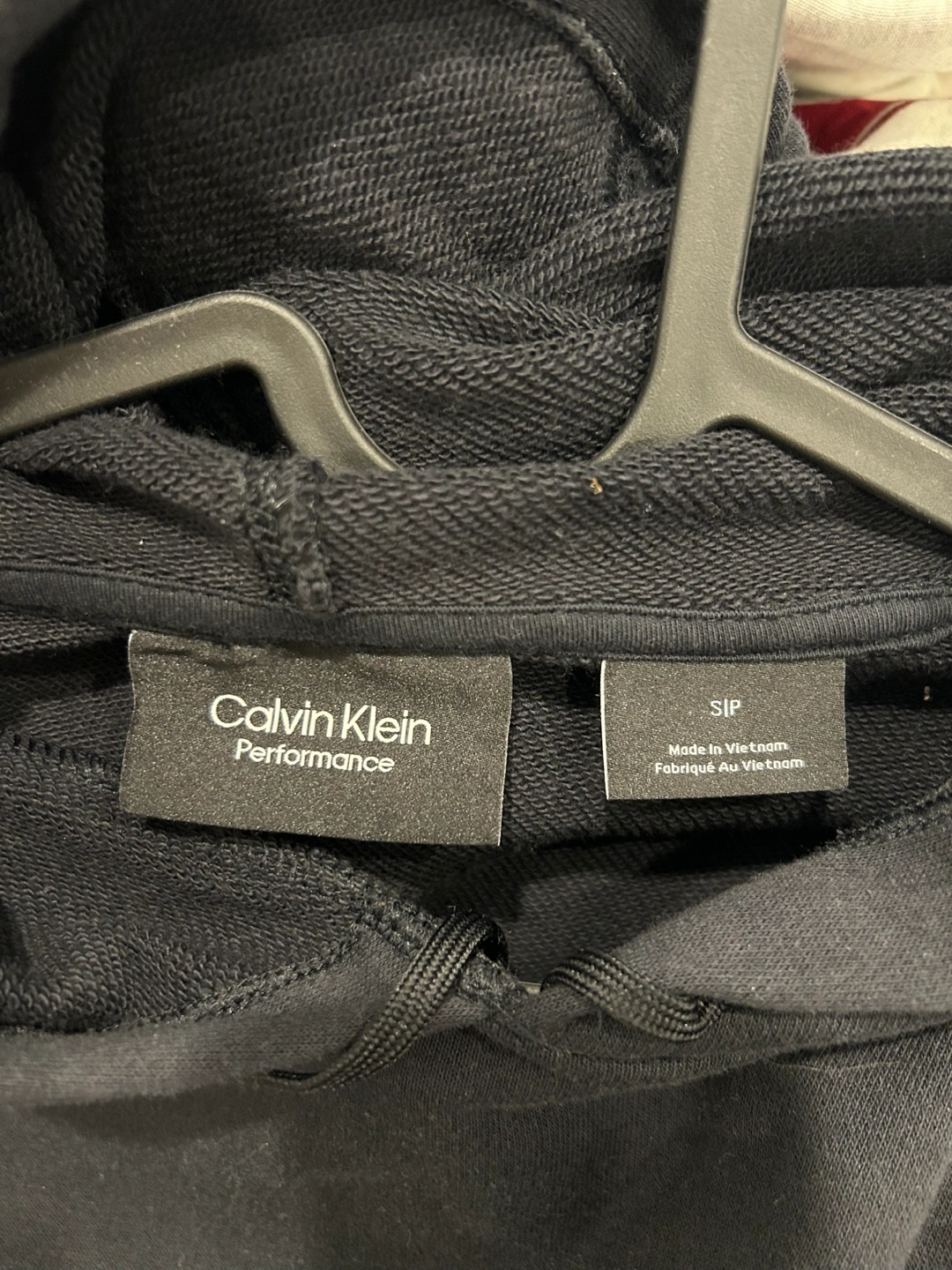 Black Calvin Klein Performance hoodie with a front pocket and a hood.
