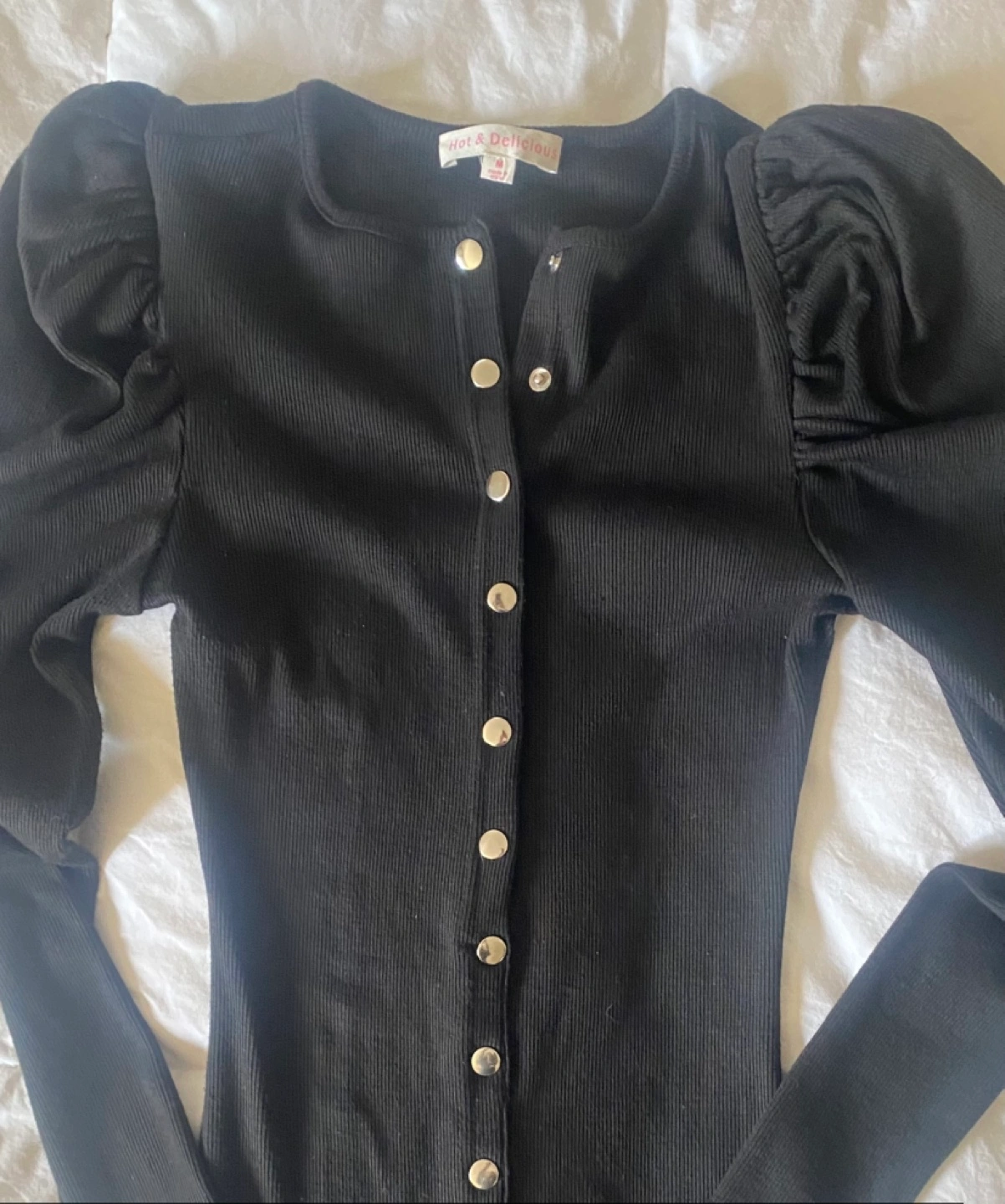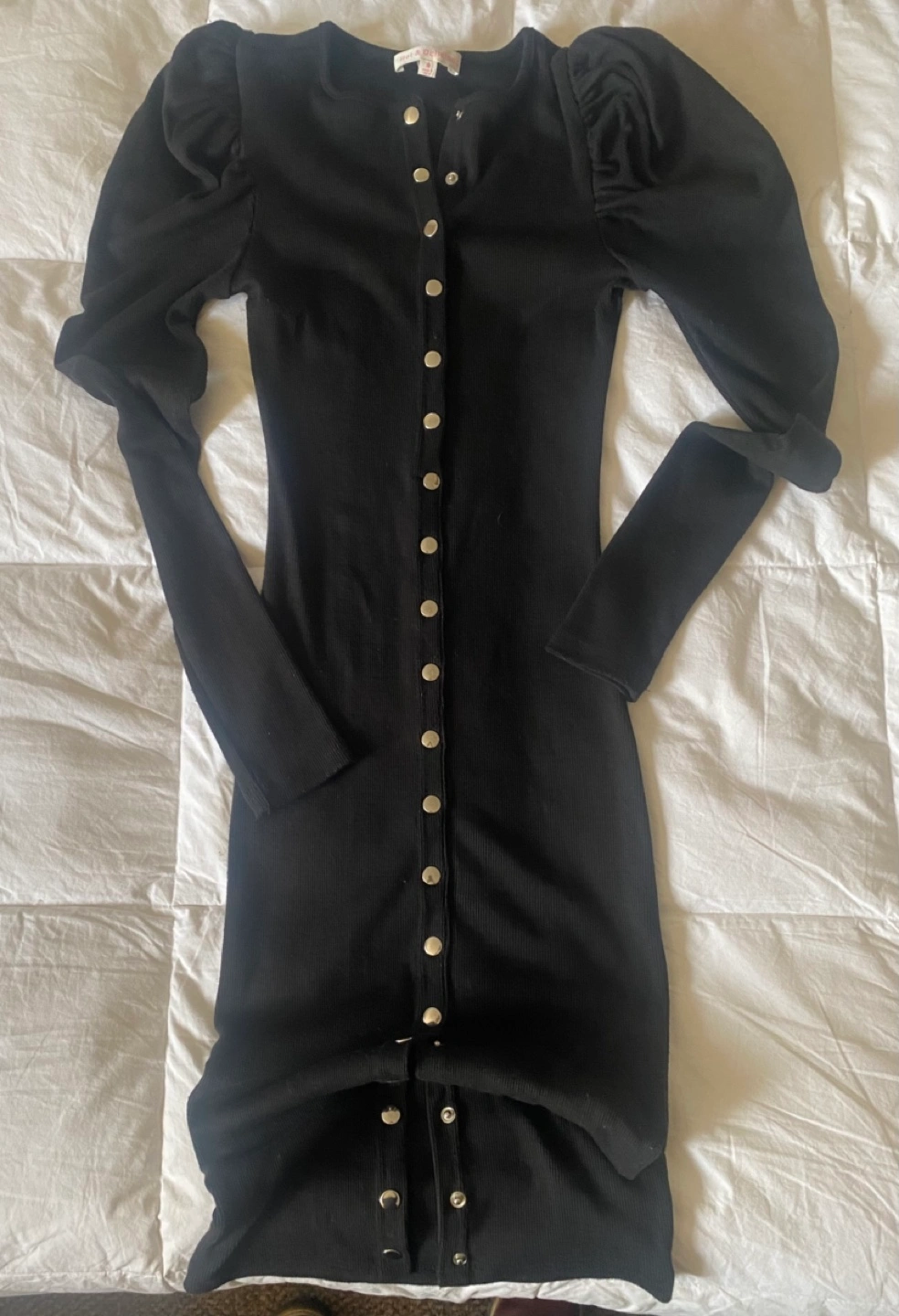 Long sleeve midi dress with puff sleeves and button up front. Black ribbed stretch fabric.