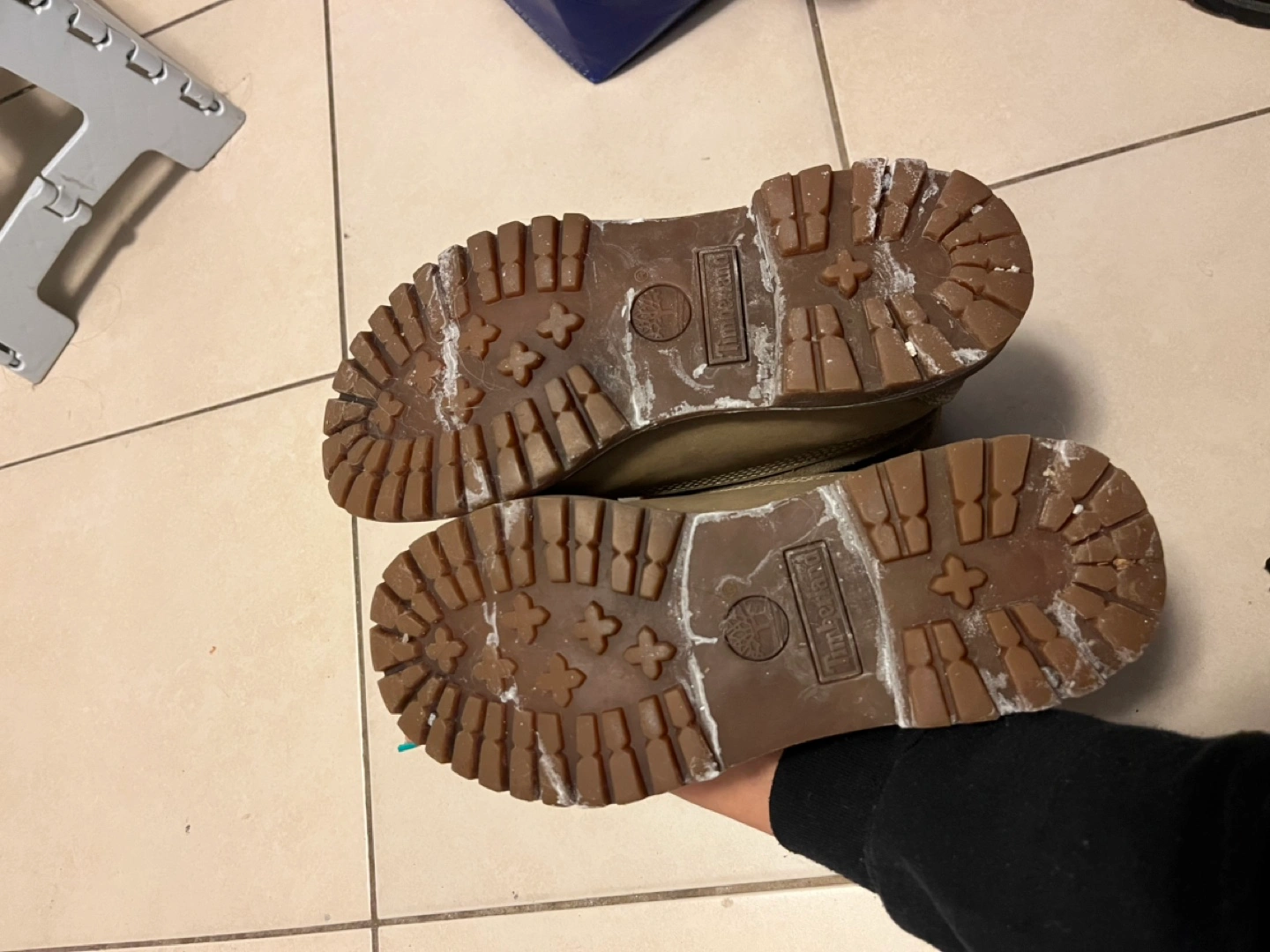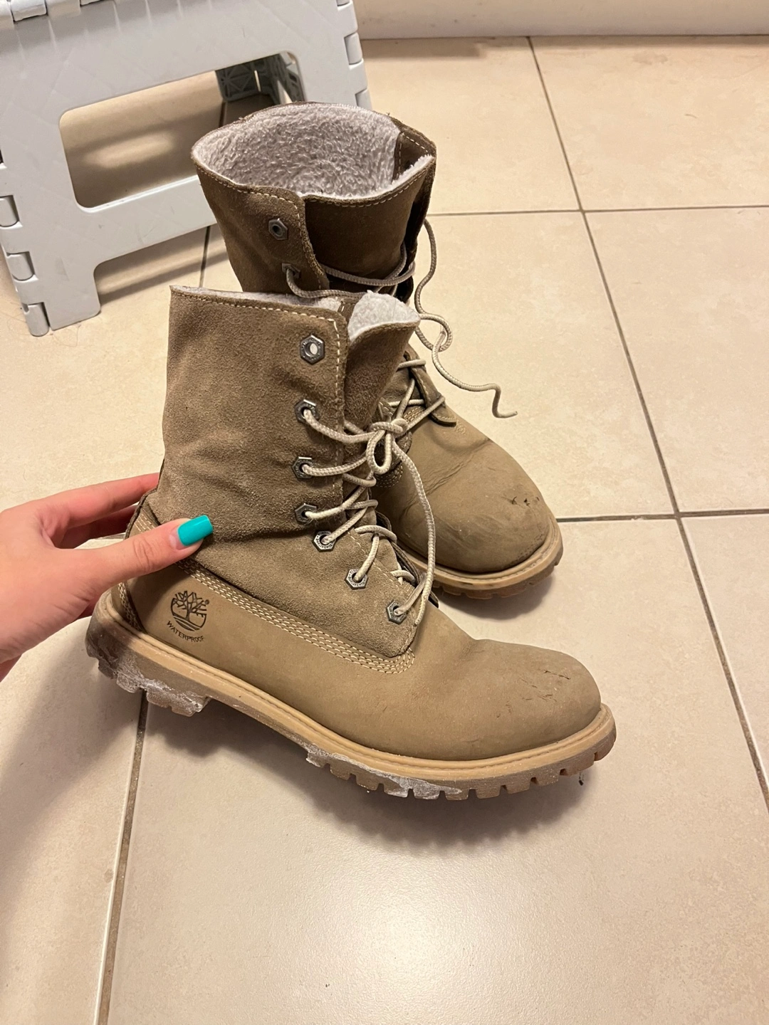 Tan suede boots with laces and a brown sole. They have a fleece lining. They are in great condition with lots of life left